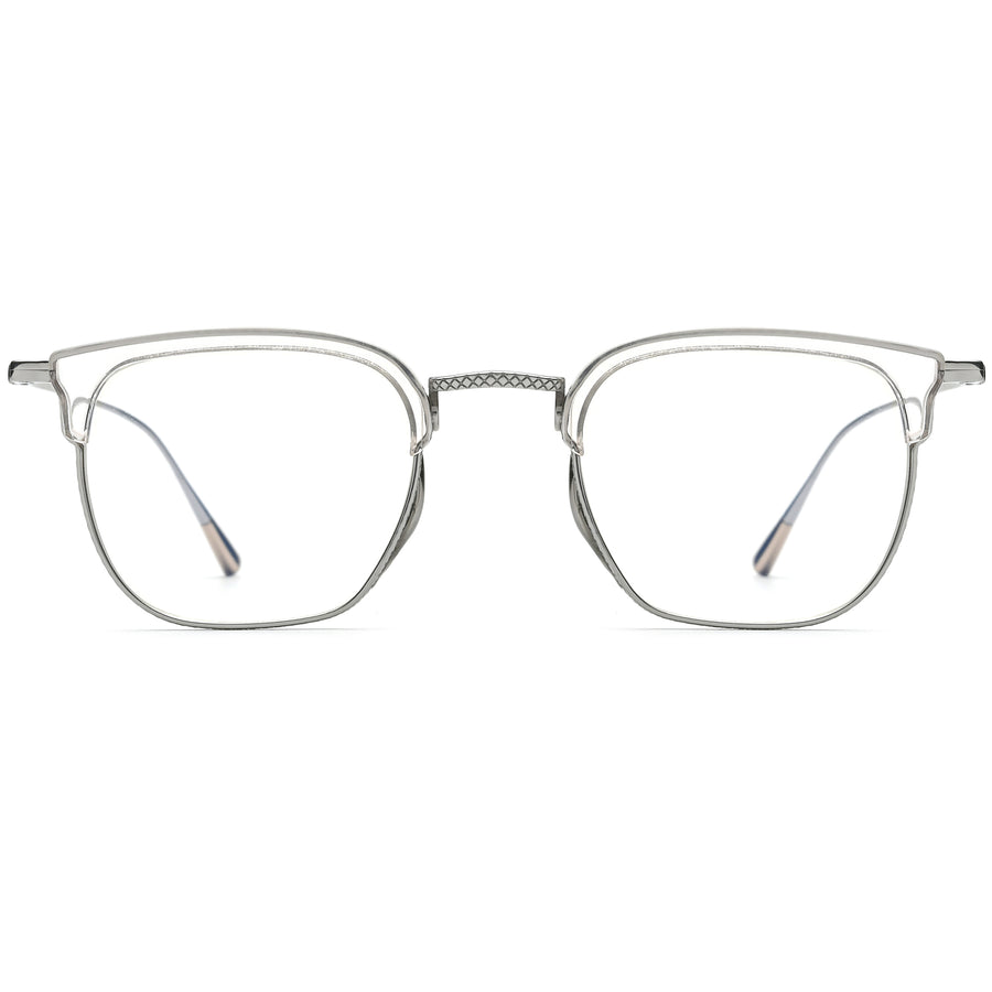 These sophisticated browline frames combine titanium and acetate to deliver timeless elegance and modern durability. Featuring a textured bridge and unique nose pads for added distinction, they ensure comfort without compromising on style. The intricate detailing along the square titanium frame and contrasting acetate top bar create a unique vintage-inspired look. Lightweight yet sturdy, these glasses are perfect for everyday wear or special occasions. Whether in sleek metallic finishes or bold color combinations, they add a refined touch to any ensemble.