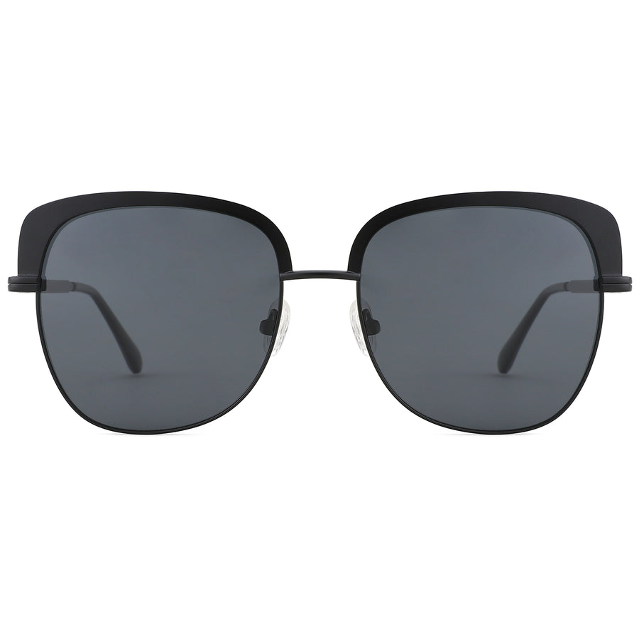 These browline sunglasses feature a sleek, oversized square design that combines minimalist elegance with a bold presence. The frame is crafted from lightweight metal. The slightly rounded square lenses provide a stylish twist on the classic square silhouette and a perfect blend of vintage charm and modern flair. The dark-tinted polarized lenses provide 100% UV protection, ensuring that your eyes are well shielded from harmful UVA and UVB rays while reducing glare for optimal visual clarity. Adjustable silicone nose pads and spring hinges provide a personalized fit, making these sunglasses comfortable to wear for extended periods. The slim metal temples are designed with rounded ends for a secure fit behind the ears, ensuring both comfort and stability. These sunglasses are ideal for those who appreciate contemporary eyewear with a hint of classic charm. The bold square shape and matte black finish create a refined yet eye-catching look, making them perfect for both men and women who want to add a touch of high-fashion elegance to their everyday style.
