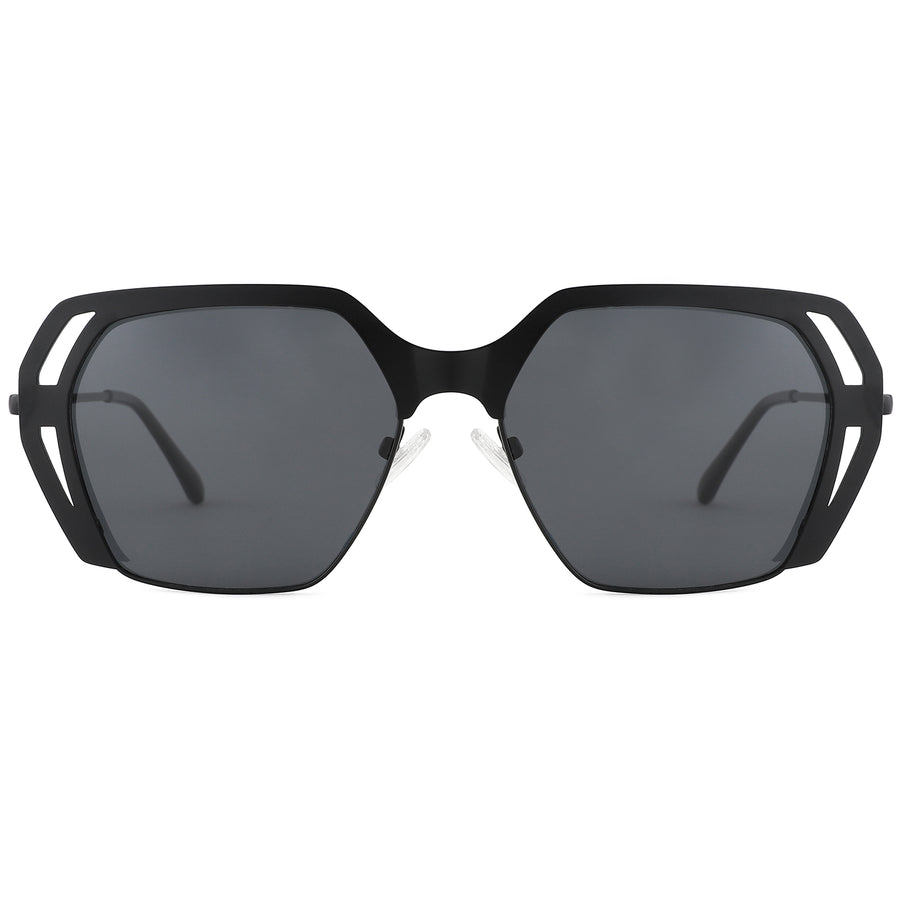 These futuristic geometric sunglasses feature a bold, high-quality metal frame with a striking cut-out design at the outer rim, offering a modern and edgy look. The oversized lenses are complemented by a chunky bridge, while dark polarized lenses provide 100% UV protection to shield your eyes from the sun. Metallic accents add a touch of sophistication, and adjustable silicone nose pads along with spring hinges ensure a comfortable and personalized fit. These sunglasses are perfect for making a bold fashion statement while ensuring maximum eye protection and comfort.