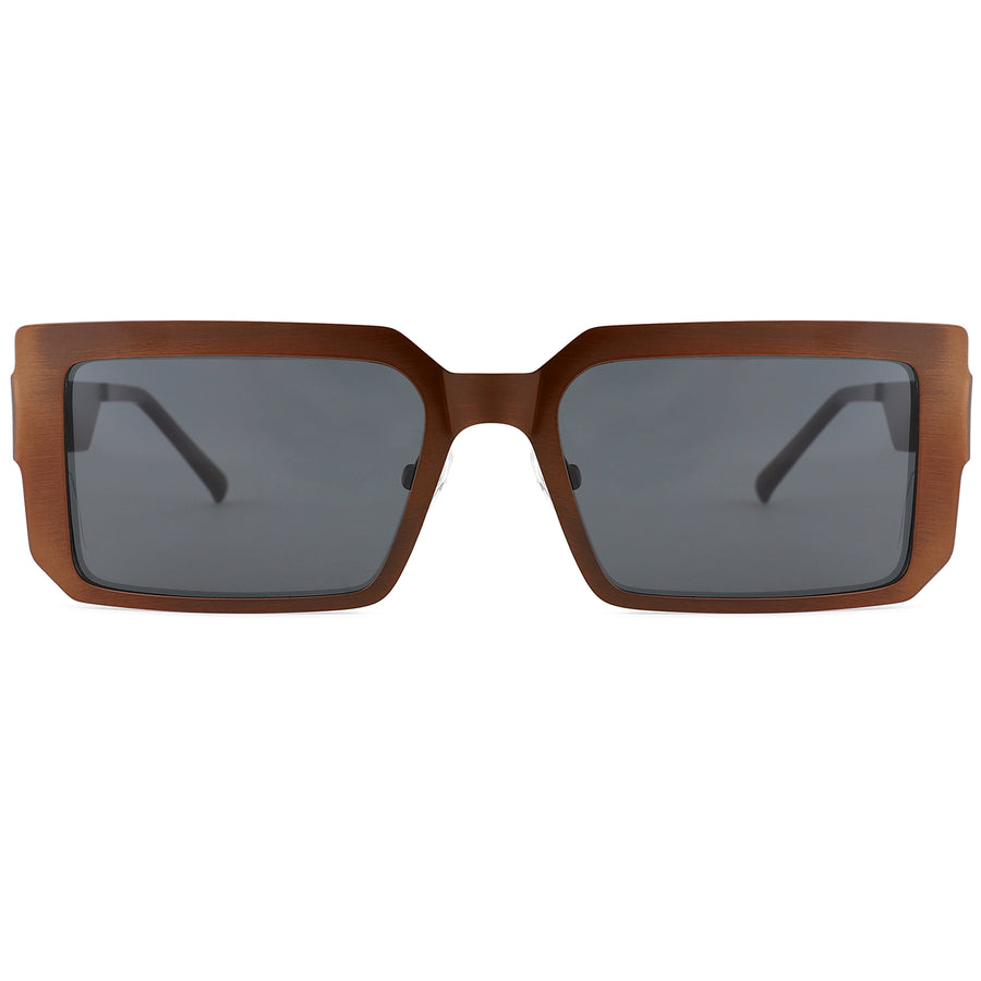 These sleek rectangle sunglasses feature a lightweight yet sturdy metal frame with a unique mechanical design, offering a distinctive aesthetic. The wide yet thin temple arms add a modern touch while ensuring durability. With adjustable nose pads, these sunglasses deliver a comfortable and secure fit. The dark polarized lenses provide 100% UVA and UVB protection, ensuring optimal sun safety while reducing glare. Combining durability with visual appeal, these sunglasses are perfect for those who value both style and functionality.