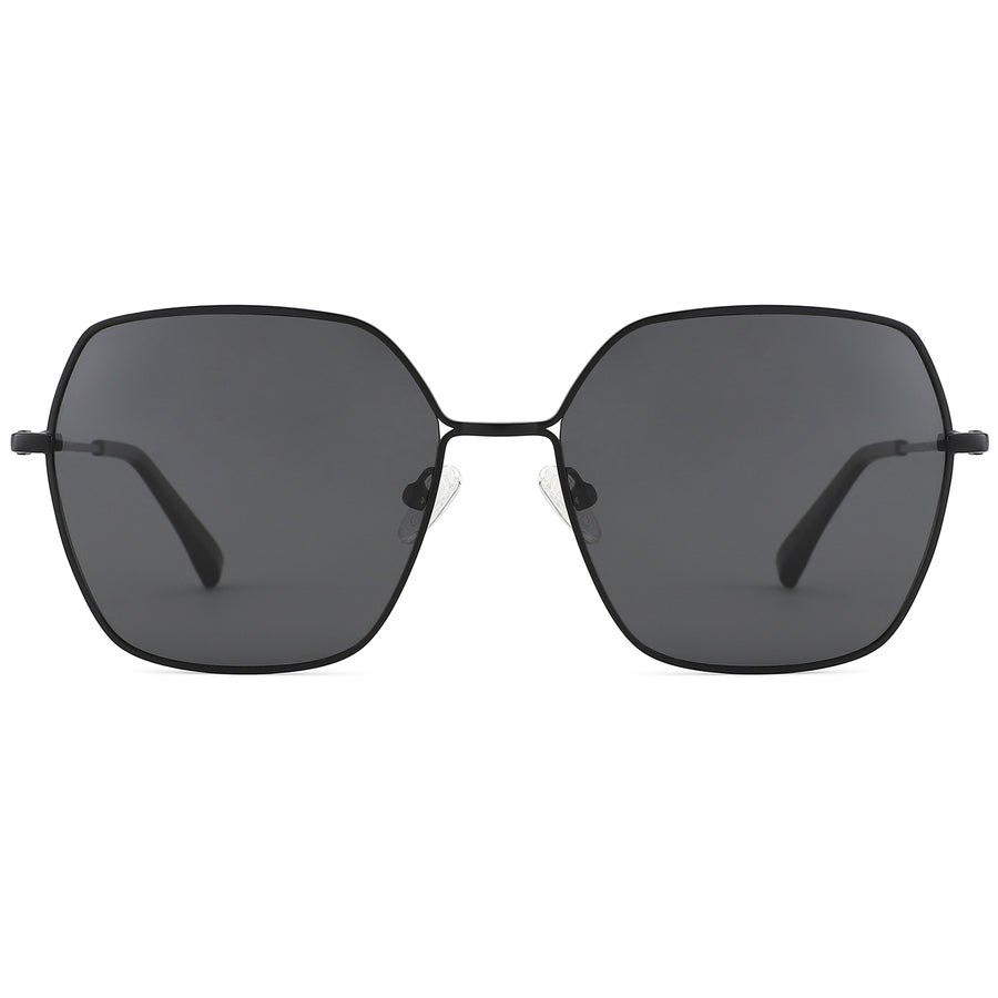 These oversized square sunglasses are crafted from sleek metal with slim rims, designed specifically for larger faces. The large lens shape offers bold, stylish coverage, while the intricate cut-out design at the bridge adds a modern touch. The color of the front rim perfectly matches that of the temple tips, creating a cohesive and polished look. Adjustable nose pads and spring hinges ensure a customized, comfortable fit, making these sunglasses ideal for all-day wear with a blend of fashion and function.