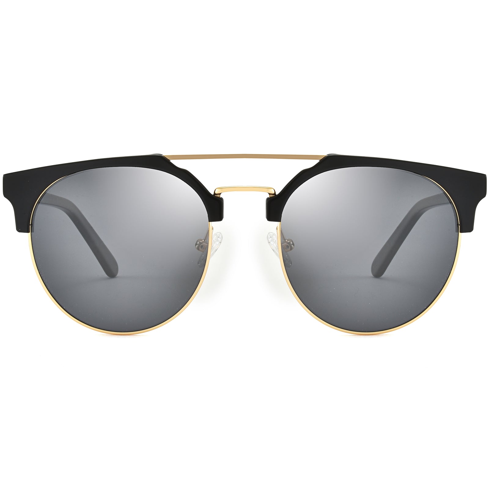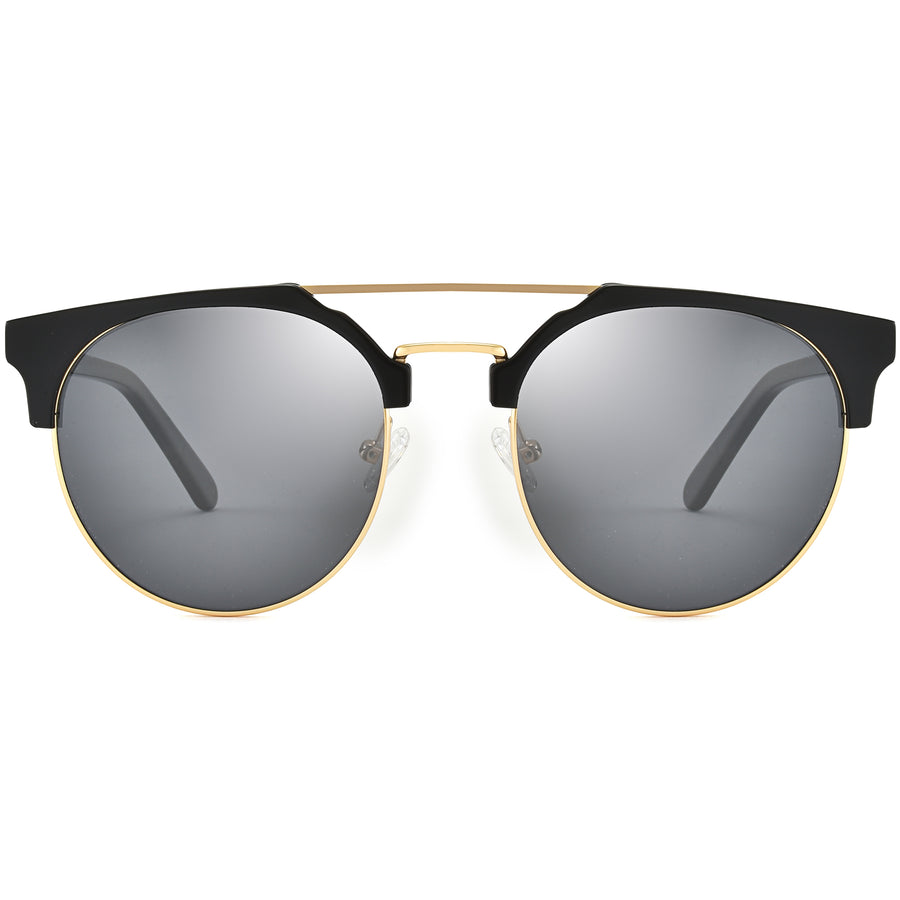 These sunglasses reimagine the classic aviator style with a modern flair, featuring a bold matte black acetate frame and a sleek, streamlined silhouette. The distinctive double bridge adds architectural interest to the rounded aviator shape, giving the frames a unique and contemporary edge. Mirrored gray lenses offer a vibrant and eye-catching contrast to the matte black frame, enhancing the overall aesthetic appeal. The polarized lenses reduce glare for clear, comfortable vision even in bright sunlight, and provide 100% UVA and UVB protection to keep your eyes safe during outdoor activities. The temples are crafted from smooth acetate, adding a lightweight feel, and are finished with black acetate tips for a secure and comfortable fit behind the ears. With adjustable nose pads and a lightweight construction, these sunglasses ensure a customized fit suitable for all-day wear.
