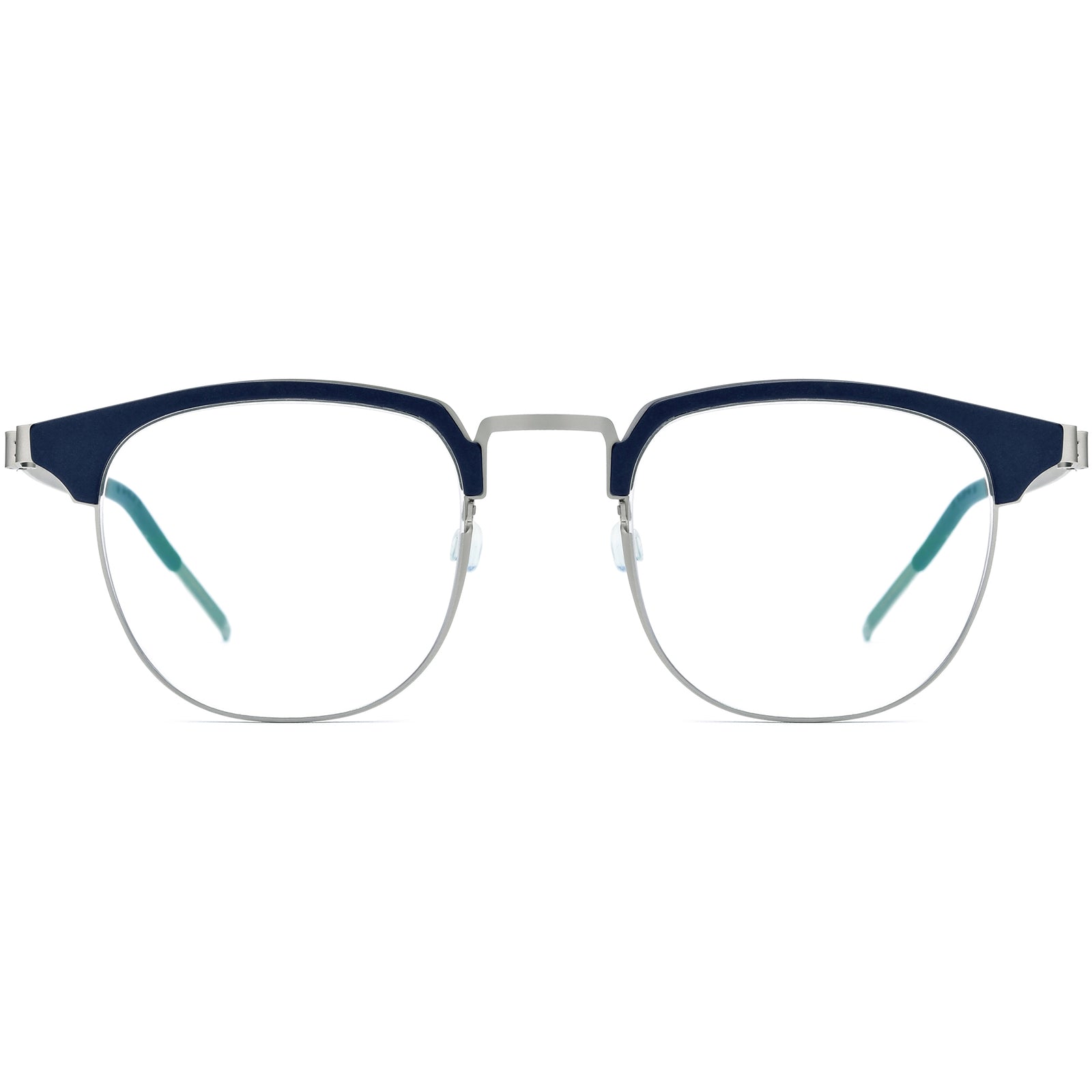 Crafted with a medium-sized browline frame, these glasses feature a full-rim design with a blue brow bar, combining timeless appeal with contemporary style. A minimalist metal detail seamlessly connects the temple arms to the frame, adding an understated, modern edge. Adjustable nose pads guarantee a secure, comfortable fit, making these glasses perfect for all-day wear. Suitable for both professional and casual settings, they enhance heart and oval face shapes with their subtle, elegant design.