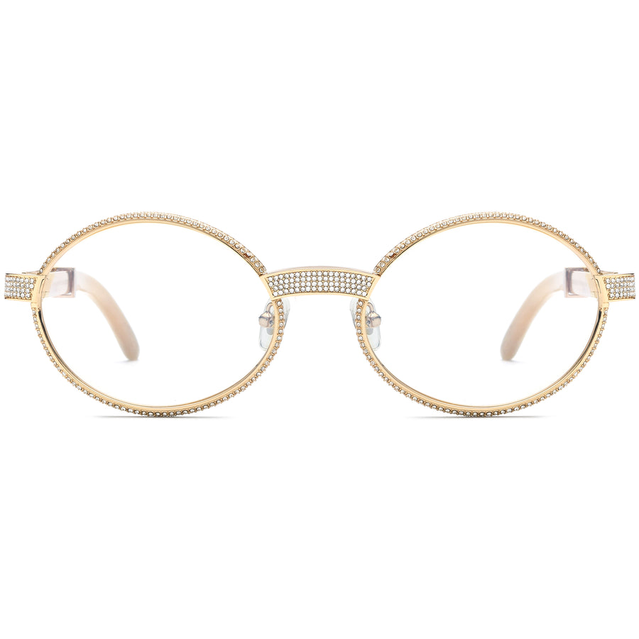 Discover our luxurious oval eyeglasses, where elegance meets functionality. The front dazzles with intricate rhinestone embellishments set in a luminous gold metal frame. Choose temples crafted from pristine white buffalo horn, deep black buffalo horn, or textured rosewood. A blend of artistry and comfort for the discerning eye.