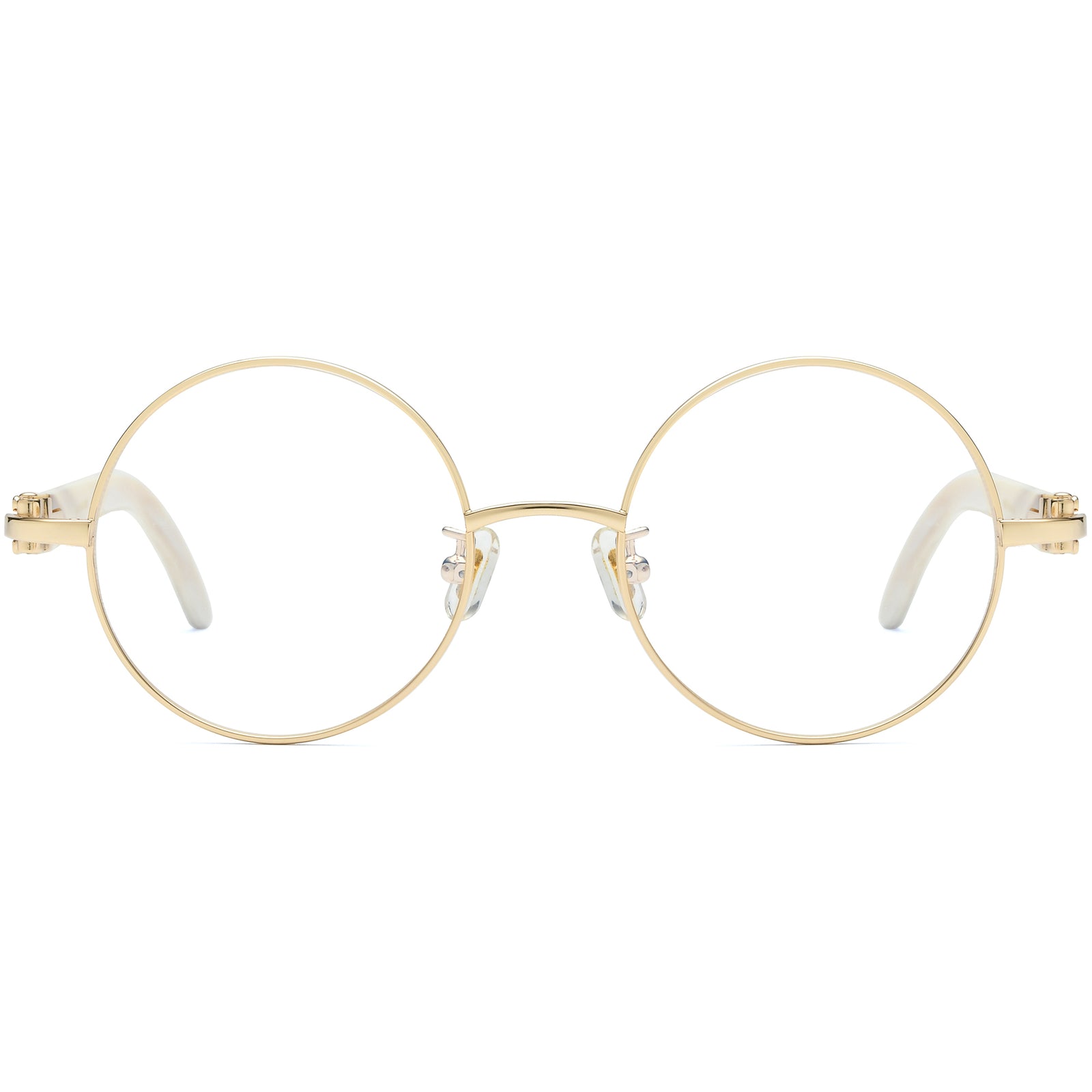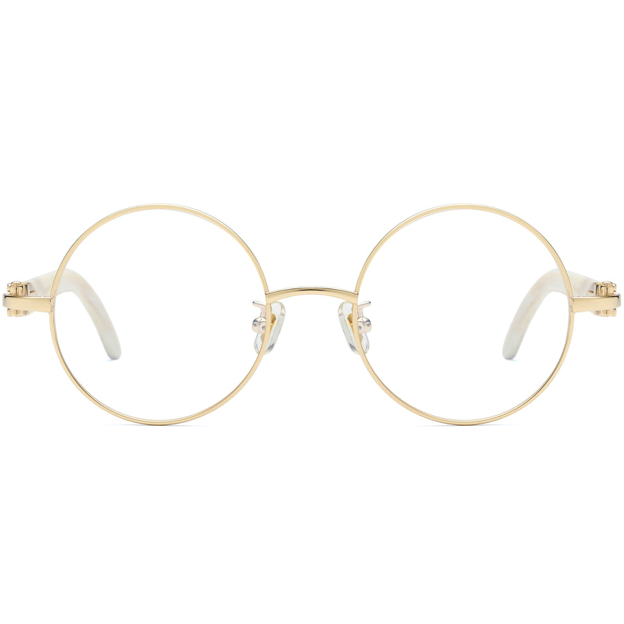 Embrace sophistication with these full-rim, round eyeglasses available in both gleaming gold and sleek silver metallic options. The frames, crafted with precision, are accentuated by the richly textured buffalo horn temples, adding a touch of organic luxury. Whether in gold's warmth or silver's cool elegance, these glasses are a statement of refined style and craftsmanship. Choose your hue and radiate distinction.