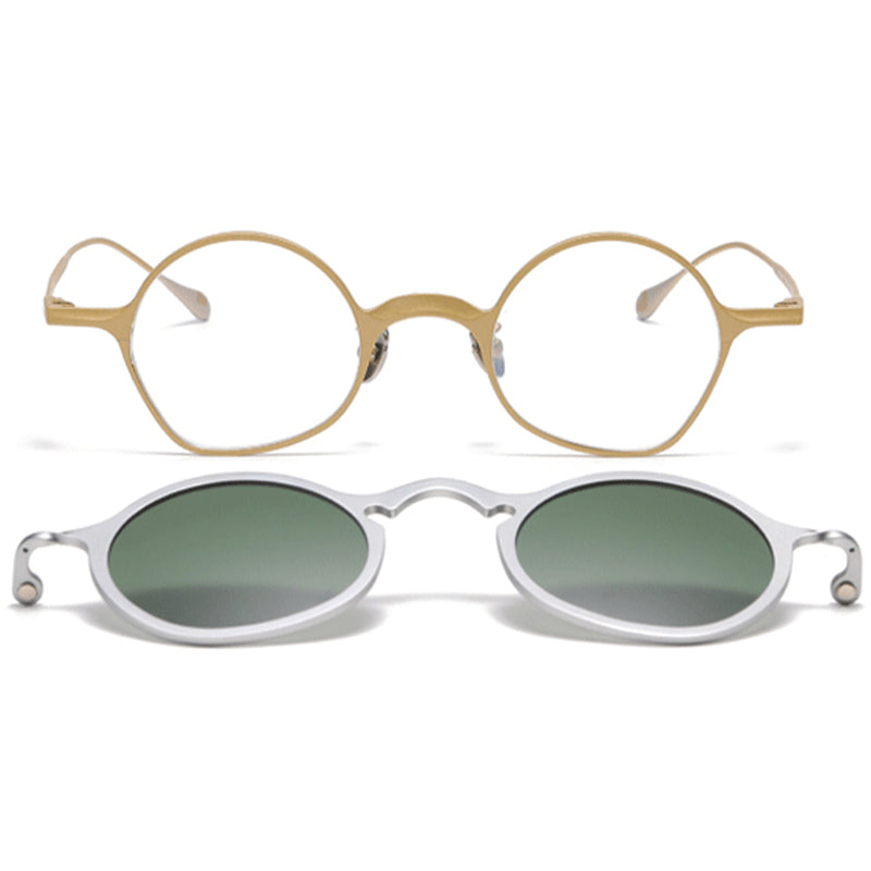 Designed with a vintage-inspired, aged appearance, these titanium geometric glasses feature magnetic clip-ons with polarized lenses for full UV protection. The unconventionsl lens shape evoke a sense of classic, antique style. Ultra-slim metal temple arms add to the lightweight comfort, while adjustable nose pads ensure a snug, secure fit. Whether for daily wear or special occasions, these glasses offer a blend of elegance and practicality, making them perfect for all-day use.