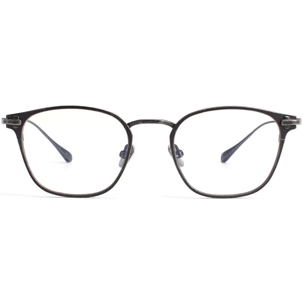 Ultra-light distressed titanium frame with softly squared lenses and a barely-there profile. The matte charcoal front pairs with flexible, slim temples and coated tips for pressure-free all-day wear. Adjustable titanium nose pads keep the frame stable, even with higher prescriptions. A clean, modern choice that slips easily from office to weekend, flattering medium faces with oval, round, or heart shapes. Ideal if you want minimalist style with the comfort of featherweight metal construction that disappears once you put them on.
