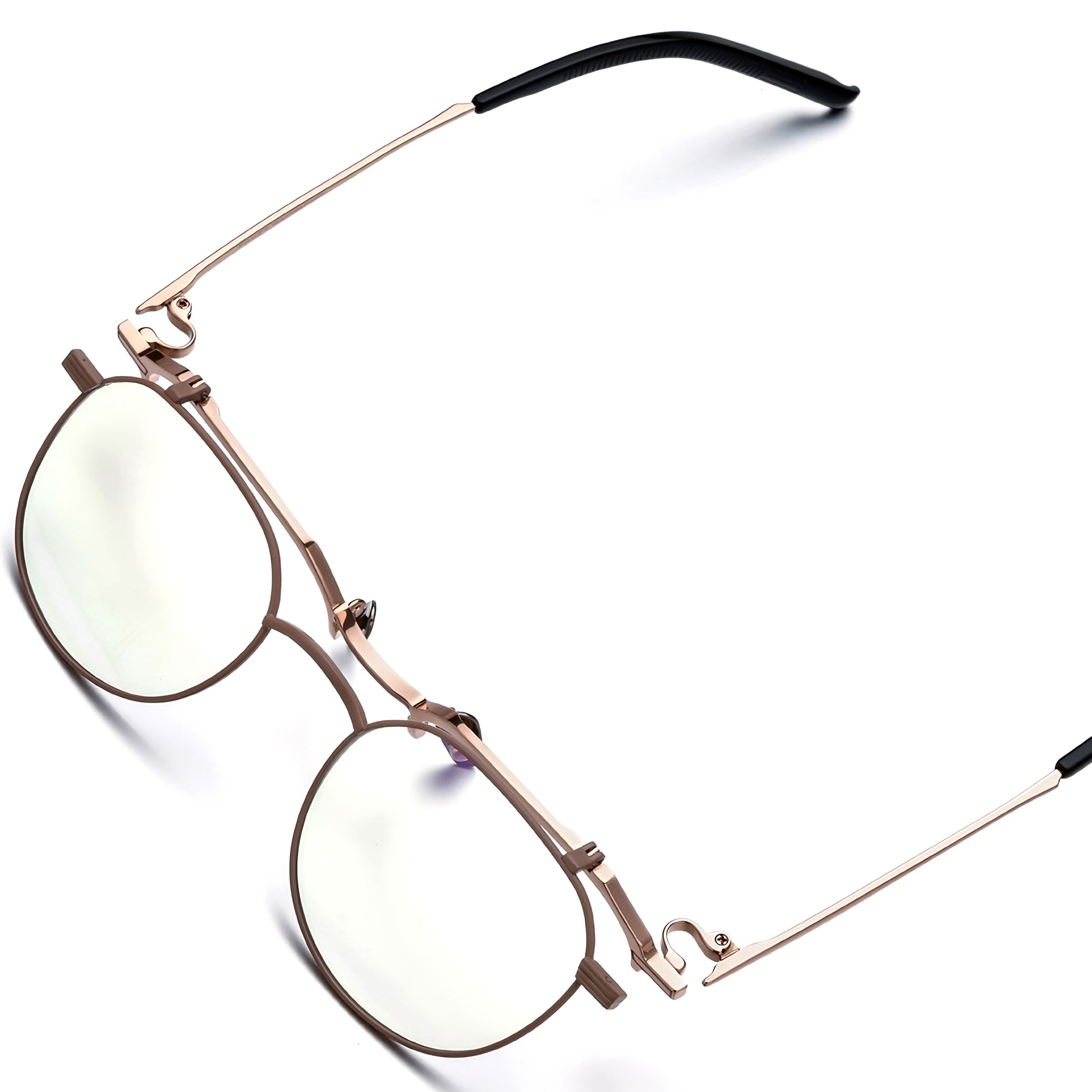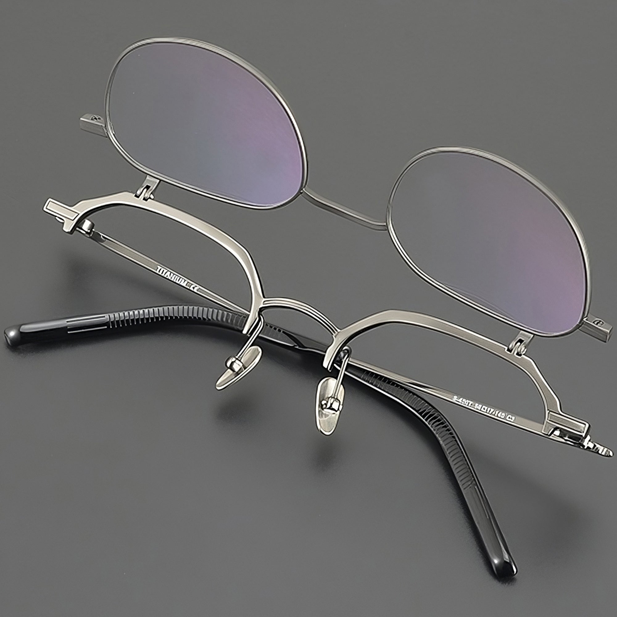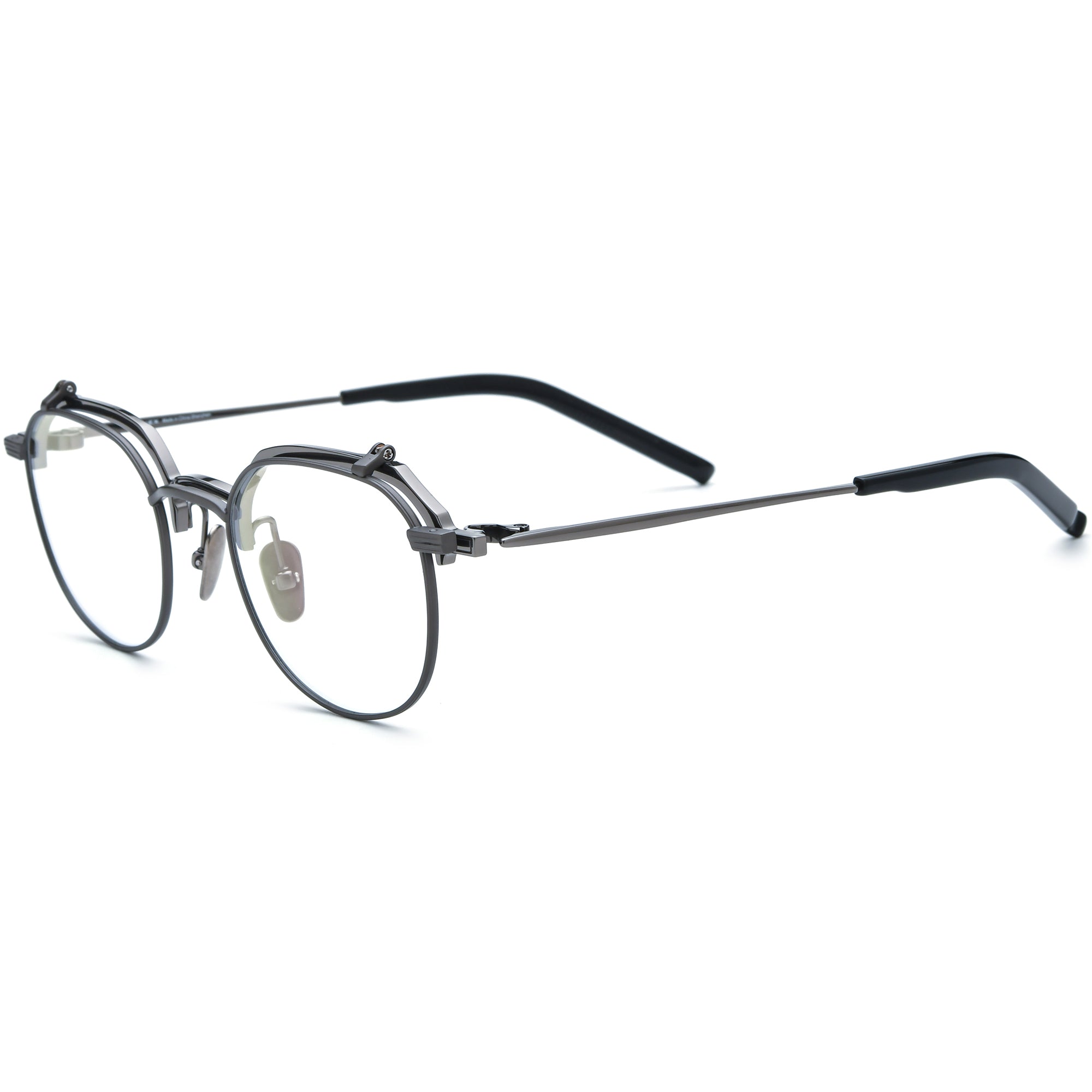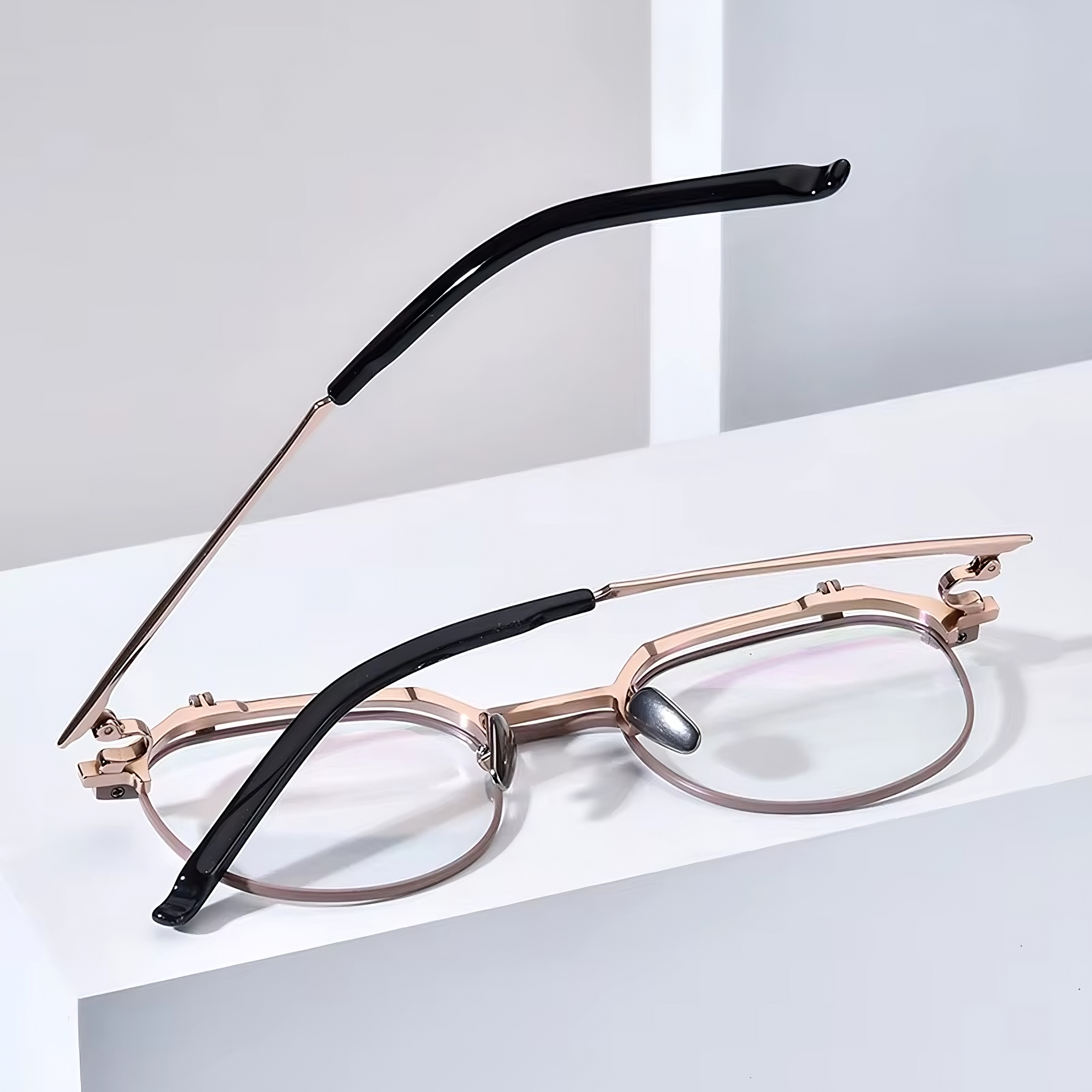 Experience premium style and durability with these pure titanium flip-up eyeglass frames. Crafted for ultra-light comfort and long-lasting strength, the design features a soft square shape with rounded corners—almost circular—for a clean, modern look that suits both men and women. The standout flip-up front lets you lift the lenses instantly for unobstructed vision, making them ideal as flip-up prescription glasses, flip-up reading glasses, or flip-up blue light glasses for work and everyday wear. Adjustable titanium nose pads provide a secure, customized fit, while the sleek temples feel pressure-free. For added comfort and stability, the temple tips feature vertical ridges that help wick away sweat and improve anti-slip grip, keeping the frames steady during long wear. Available in multiple finishes, these minimalist titanium frames blend timeless elegance with practical performance.