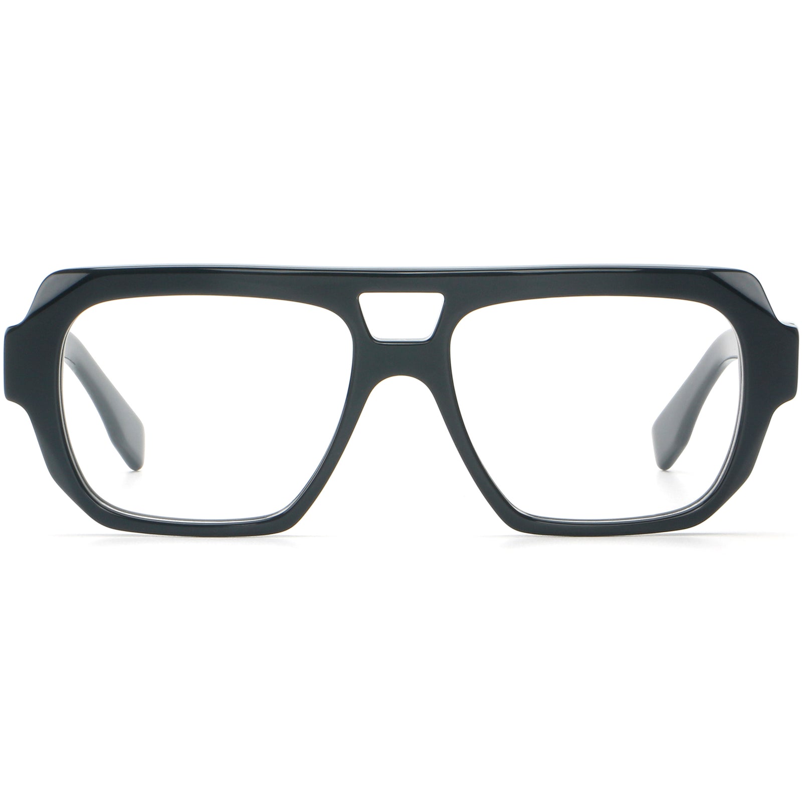 Commanding navigator-style eyeglasses with a bold squared front and a sculpted mini-brow cutout for vintage-sport attitude. Thick acetate rims and angular temples deliver presence without sacrificing comfort, with a smooth bridge and reinforced hinges for daily durability. Wide lenses give an open field of view—ideal for single-vision or progressive prescriptions for men. Medium–large fit. Available in glossy black, inky navy crystal, classic tortoise, and warm amber crystal. A statement frame that reads confident, modern, and effortlessly cool.