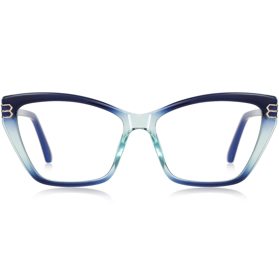Command attention in these oversized cat-eye eyeglasses, sculpted from premium TR90 plastic. The crisp upswept brow and softly squared lenses flatter oval, round, and heart faces. Lightweight construction, an ergonomic bridge, and durable spring hinges deliver pressure-free, all-day comfort. Refined metal accents elevate the look. Progressive-friendly and prescription-ready, they accept blue-light, photochromic, or sun-tint lenses. Available in navy-to-aqua ombré crystal, rose tortoise crystal, and classic black. The perfect women’s acetate glasses for work, weekends, and travel. With lasting durability.
