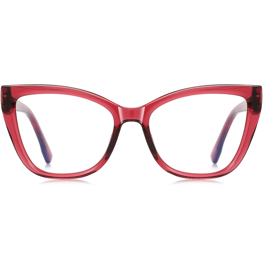 Striking women’s cat-eye eyeglasses in lightweight TR90 with glossy translucent finish. The refined upswept shape lifts and defines, flattering round, oval, and heart faces. Durable spring hinges, integrated nose pads, and tapered temple tips ensure a secure, pressure-free fit for all-day wear. Prescription-ready for single-vision, progressives, or blue-light lenses—ideal for work, study, and screen time. Available in red crystal, black, blue, tortoiseshell, and clear. Fashion-forward cat-eye frames that combine comfort, durability, and everyday style.