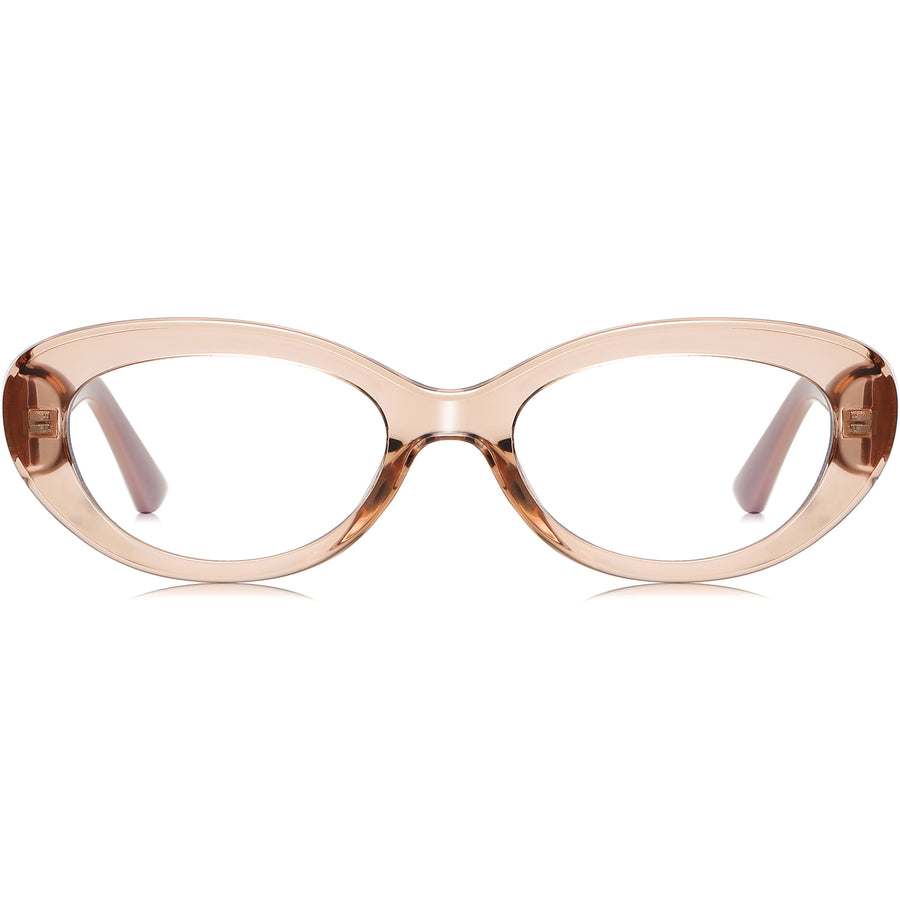 Retro oval cat-eye eyeglasses for women crafted from lightweight TR90. Sculpted wide temples with pleated texture add runway style and stability. The narrow, lifted shape elongates features and flatters round, oval, and heart faces. Smooth integrated nose pads, spring hinges and balanced weight keep them comfortable all day. Prescription-ready for single-vision, progressives, or blue-light lenses—ideal for daily wear, work, and screen time. Available in black, tortoiseshell, nude-pink, and crystal clear. Durable, chic oval cat-eye frames.