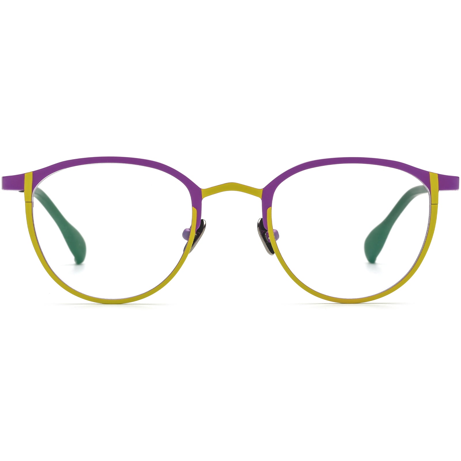 Crafted from lightweight titanium, our full-rim round glasses feature a stylish two-tone design, offering a modern twist on a classic shape. Ideal for softening square or diamond face shapes, these glasses provide both sophistication and versatility. The titanium nose pads ensure ultimate comfort, while the lightweight frame offers a secure, all-day fit. Perfect for both men and women, these glasses combine style and comfort, making them an ideal choice for everyday wear.
