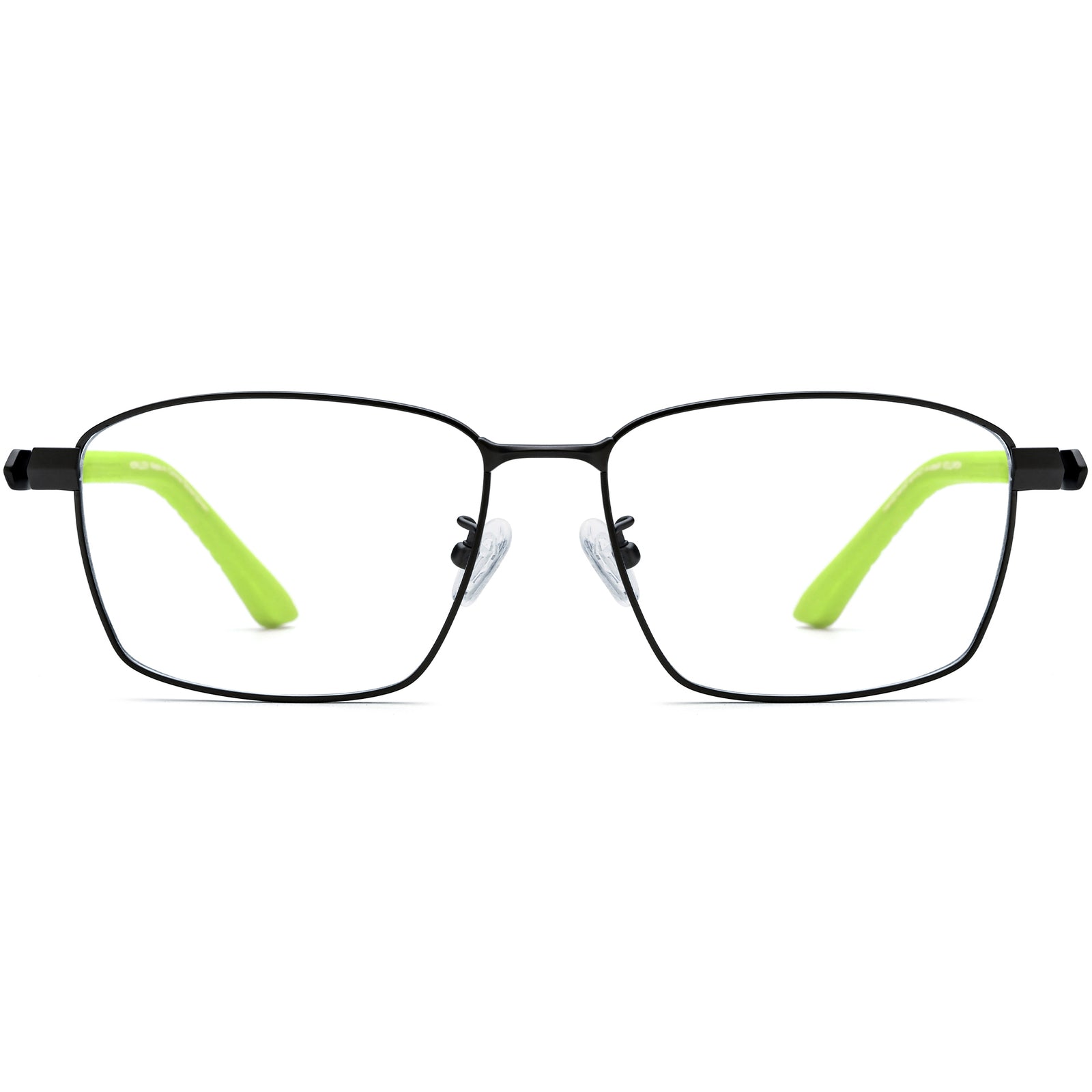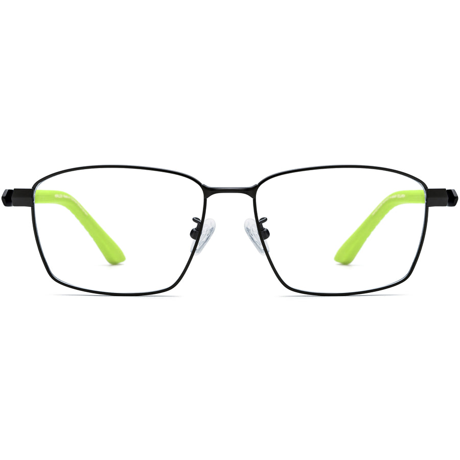 These lightweight titanium eyeglass frames combine modern durability with a bold pop of color. The sleek rectangular front is crafted from ultra-thin titanium for strength and everyday comfort, while vibrant neon green acetate temples add a sporty, fashion-forward twist. Adjustable nose pads ensure a secure fit, and flexible temples enhance all-day wearability. Perfect for professionals and trendsetters alike, these frames balance minimalist design with striking accents, suiting square, oval, and heart-shaped faces effortlessly.