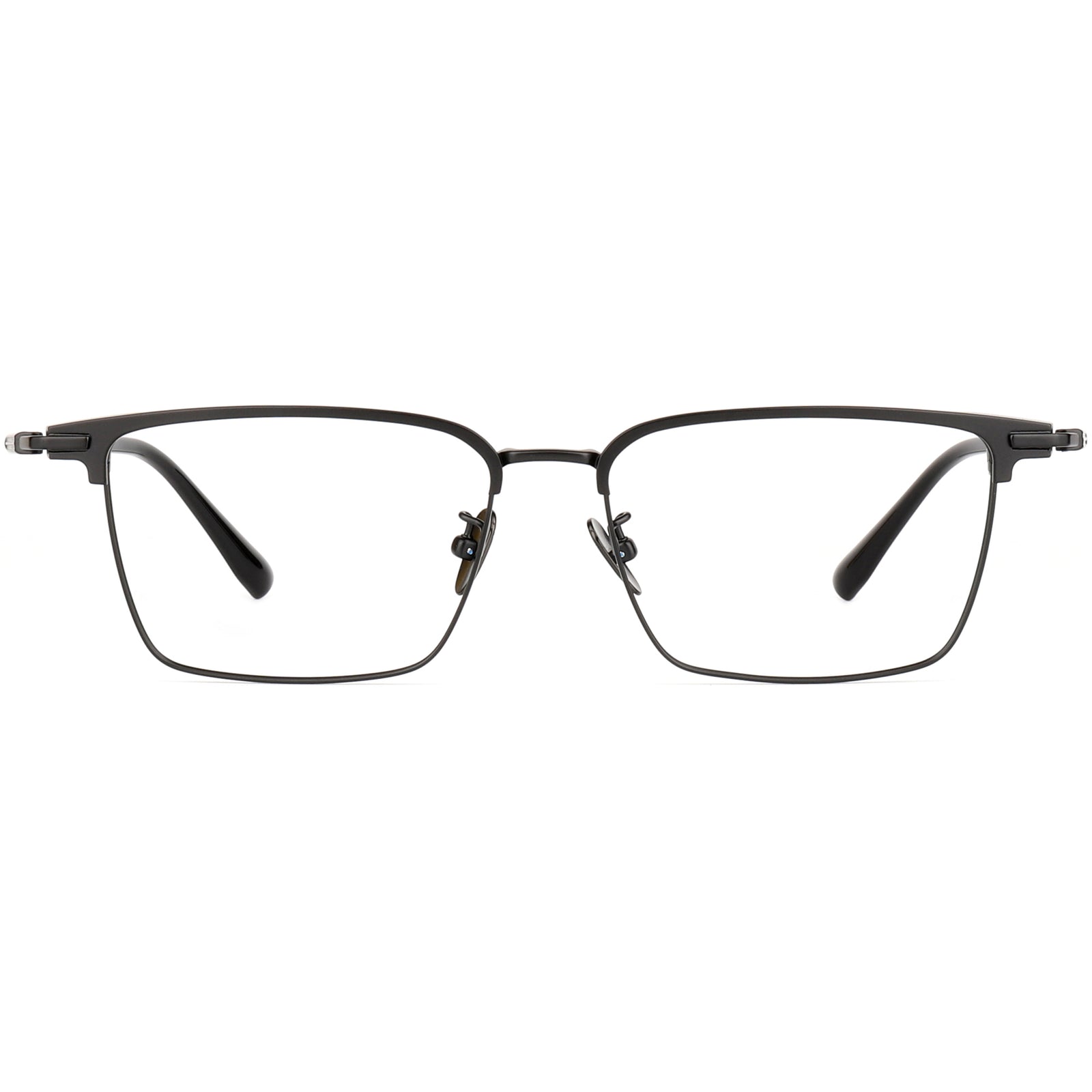 Upgrade your everyday look with these minimalist men’s square browline glasses in a sleek finish. The lightweight titanium build keeps them comfortable from morning to night, while flexible spring hinges add a pressure-free fit for easy on/off and a better wrap on wider faces. Clean lines and a modern brow detail deliver a sharp, professional style for work or daily wear for larger faces. Finished with adjustable nose pads for a secure, customized fit.