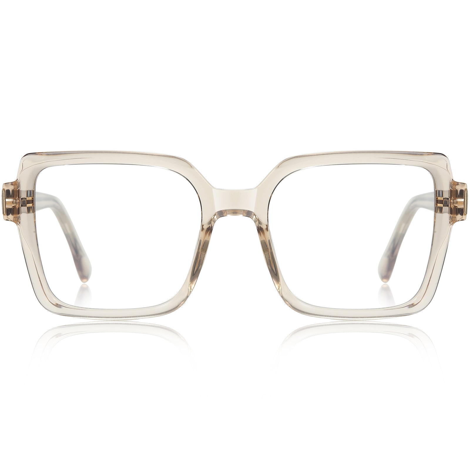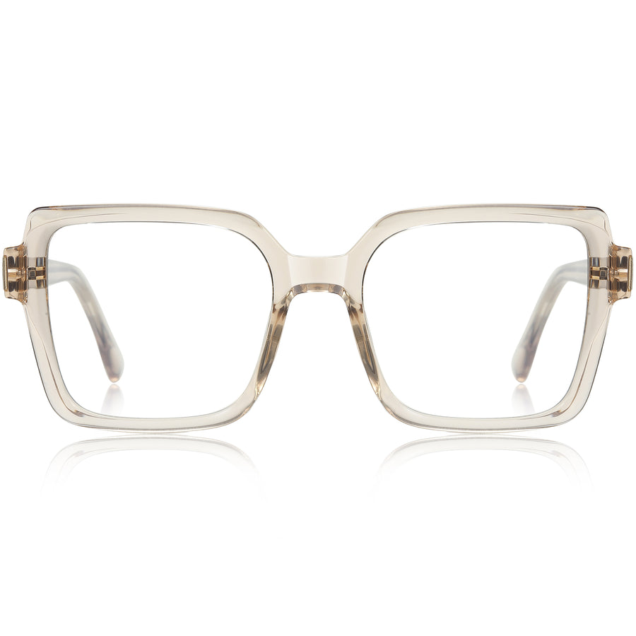 Bold women’s square glasses crafted from lightweight TR90. A thick, transparent-rim profile with polished temples and shimmering hinge accents. Flexible spring hinges, ergonomic nose pads, and wide tips ensure a secure, pressure-free fit all day. The modern soft-square shape balances round, oval, and heart faces. Prescription-ready for single-vision, progressive, or blue-light lenses. Durable, stylish everyday frames available in black, clear crystal, tortoiseshell, and cobalt blue—fashion eyewear that blends comfort, strength, and standout style.