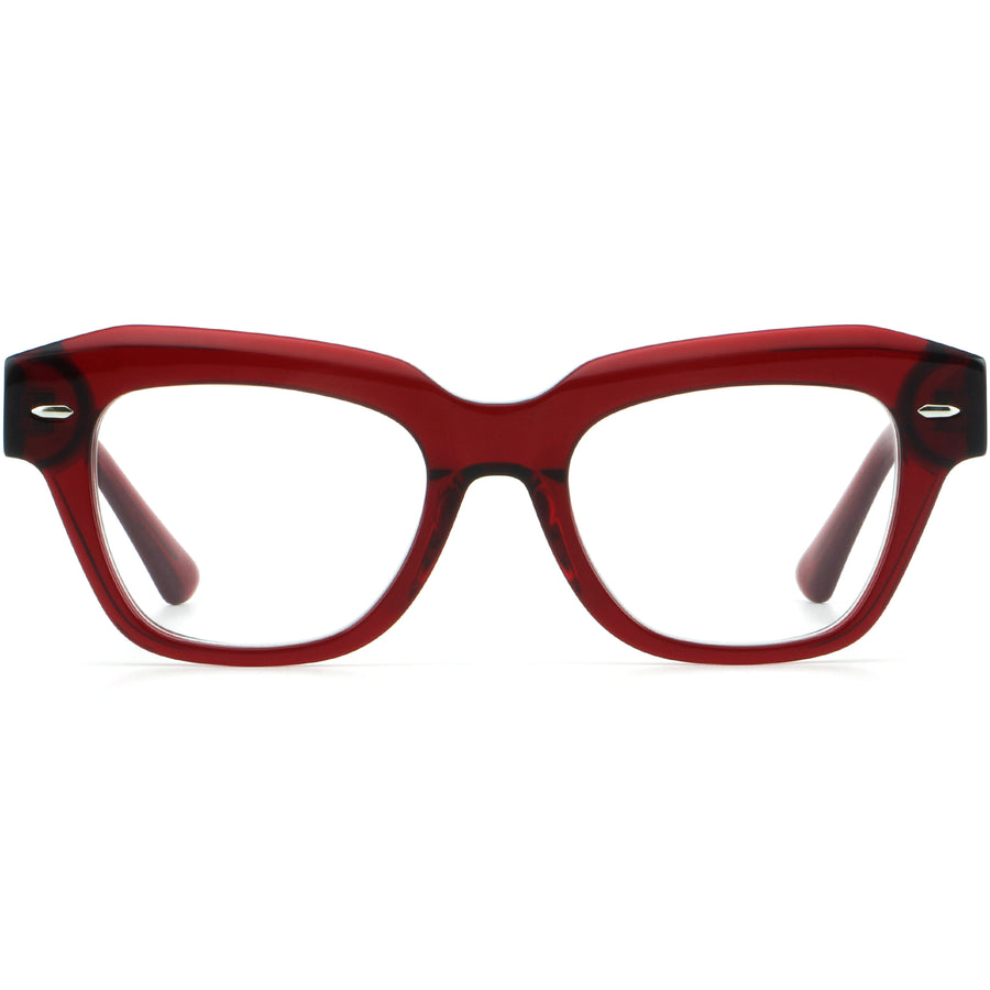 Turn heads with this boldly sculpted acetate frame. A thick, beveled brow and rectangular lenses create confident lines, while metal rivets and ribbed temple details add vintage character. The bridge and wide temples balance comfortably for day-long wear and a great fit. Available in rich translucent Red, classic Black, warm Tortoise, and modern Brown. Hand-polished acetate offers lasting durability and shine. Perfect for anyone who wants statement style with everyday ease.