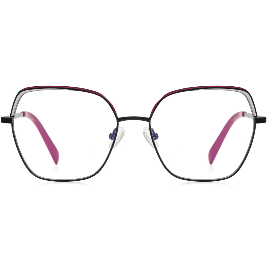 Embrace art deco-inspired sophistication with these funky geometric glasses. The metal frame showcases contrasting colored accents along the browline, crafted from lightweight and premium metal. Designed for comfort, the glasses feature acetate temple arms and adjustable nose pads, blending style with practicality.