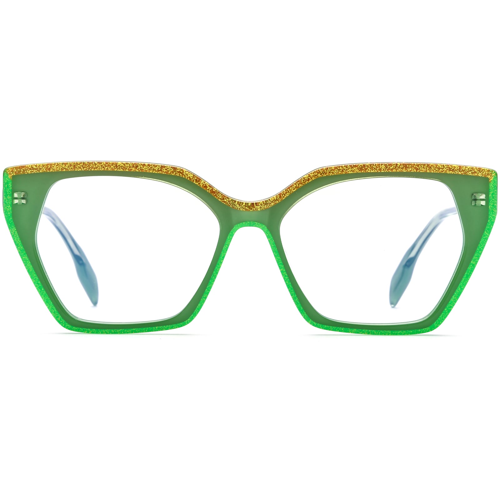 These statement glasses feature a bold, oversized cat-eye frame with dazzling glitter details along the edges, adding a touch of glam to your everyday look. Designed with lightweight acetate for durability and comfort, these glasses make a stylish yet practical choice. Perfect for those who want to make a bold fashion statement, the frames are available in vibrant colors like green, brown, and multicolor combinations. Elevate your eyewear collection with this glamorous and unique design.