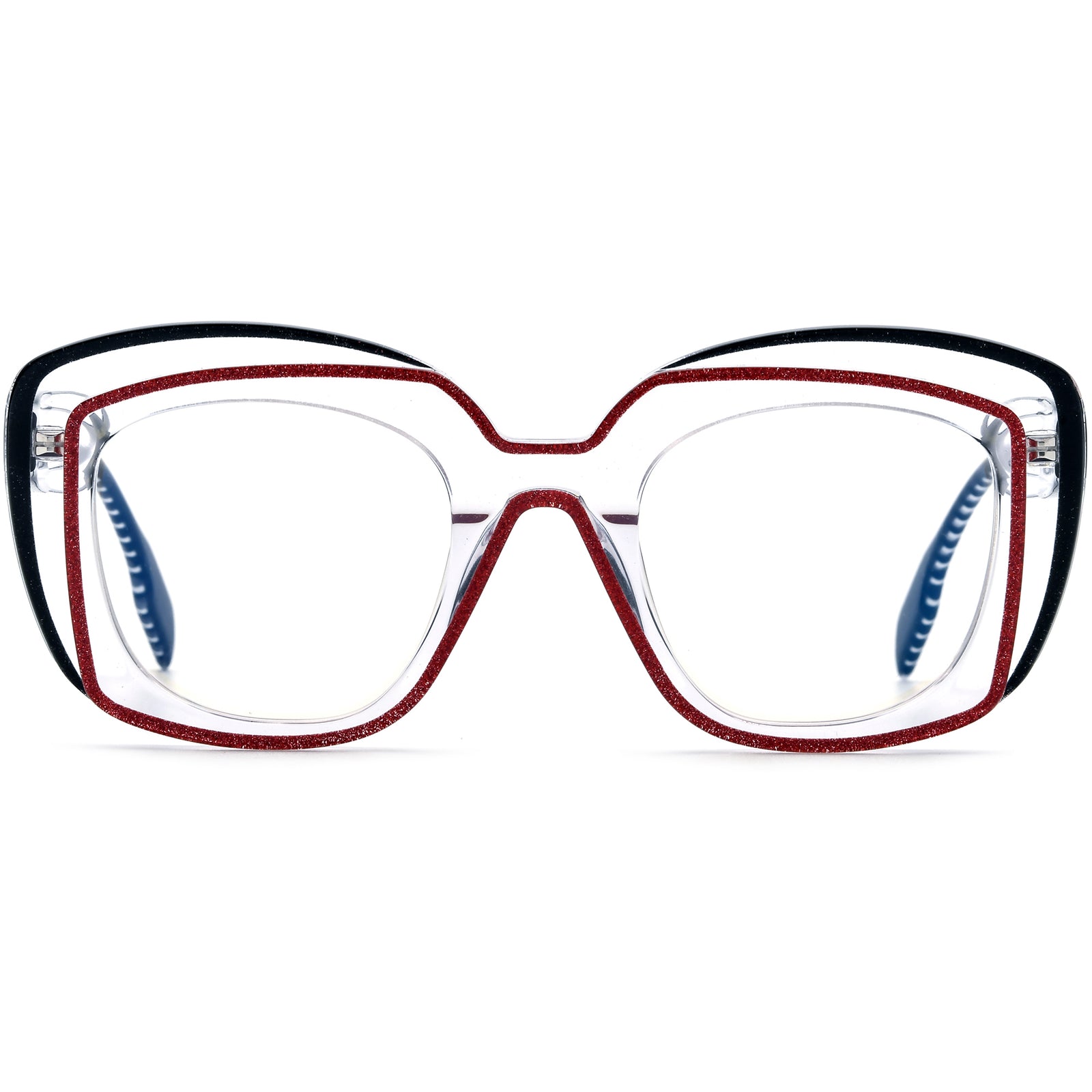 Experience glamour reimagined with our cat-eye eyeglasses, tailored exclusively for women. Crafted from premium acetate, these thick frames shimmer with a glitter-decorated rim. The unique two-layered front rim, varying in height and size, adds a modern twist to the classic silhouette. A fusion of sophistication and dazzling design for the fashion-forward woman.