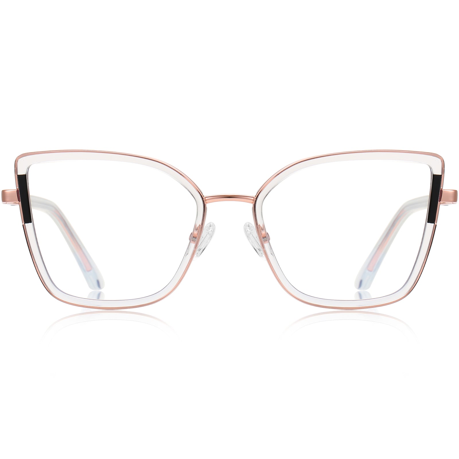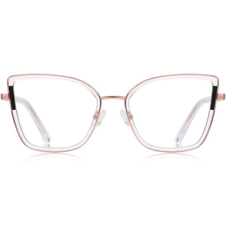 Angular cat-eye silhouette, softly squared, is sculpted from translucent TR90 that fades toward clear for a light-as-air look. Slim stainless rims trace the interior, locking into grooved metal temples with stacked ridges that catch the light. Color-block enamel corner pieces lift the brow line, flattering round, oval and heart faces. Adjustable silicone pads and hidden spring hinges keep the fit secure for all-day screen work or progressive prescriptions without pressure.