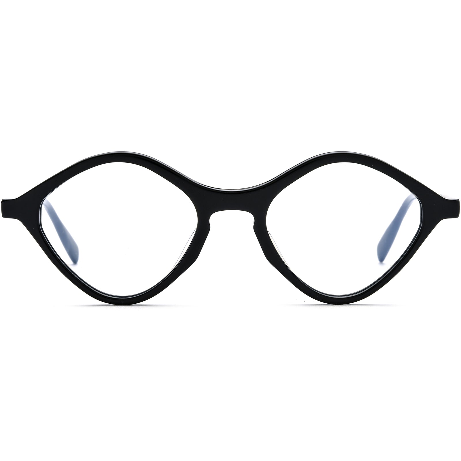 This geometric eyewear design blends creativity and comfort with its unique frame shape and color accents. The keyhole bridge provides a secure and pressure-free fit, while the lightweight frame ensures ease of wear. Available in classic black and vibrant green options, these frames are complemented by colorful temple accents for a bold and stylish look. Perfect for daily wear, these glasses suit various face shapes, combining functionality and fashion.