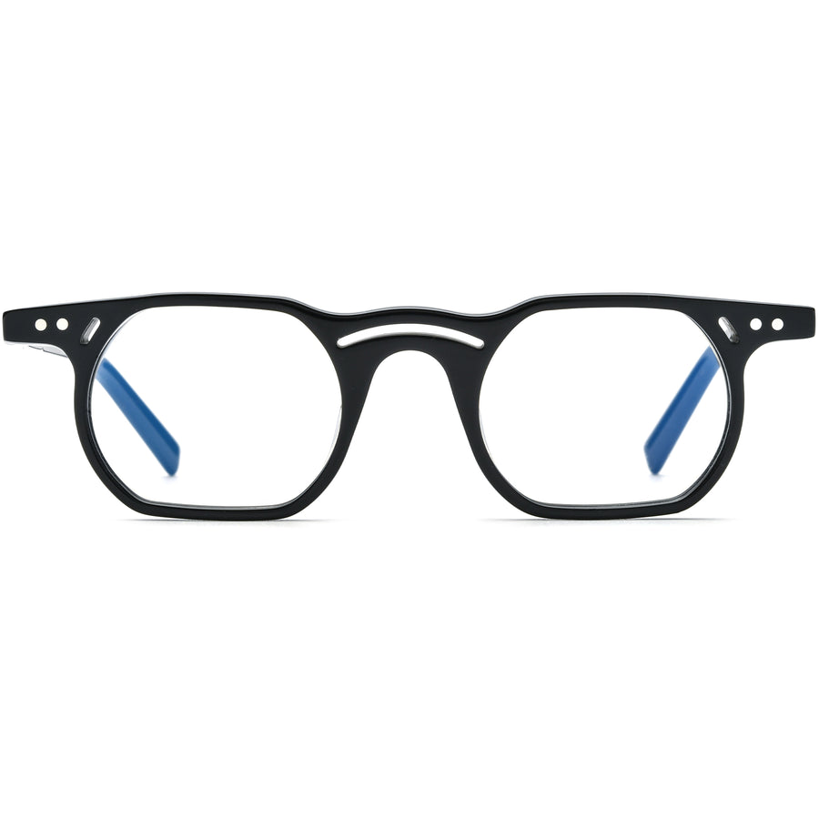 These retro-inspired geometric glasses feature a bold acetate frame with a unique bridge design for added character. The subtle rivet accents on the corners and temples enhance the vintage aesthetic, while the lightweight design ensures comfort for extended wear. The glossy finish adds a touch of sophistication, making these glasses perfect for daily wear or a standout fashion statement. Timeless and versatile, they blend functionality with style effortlessly.