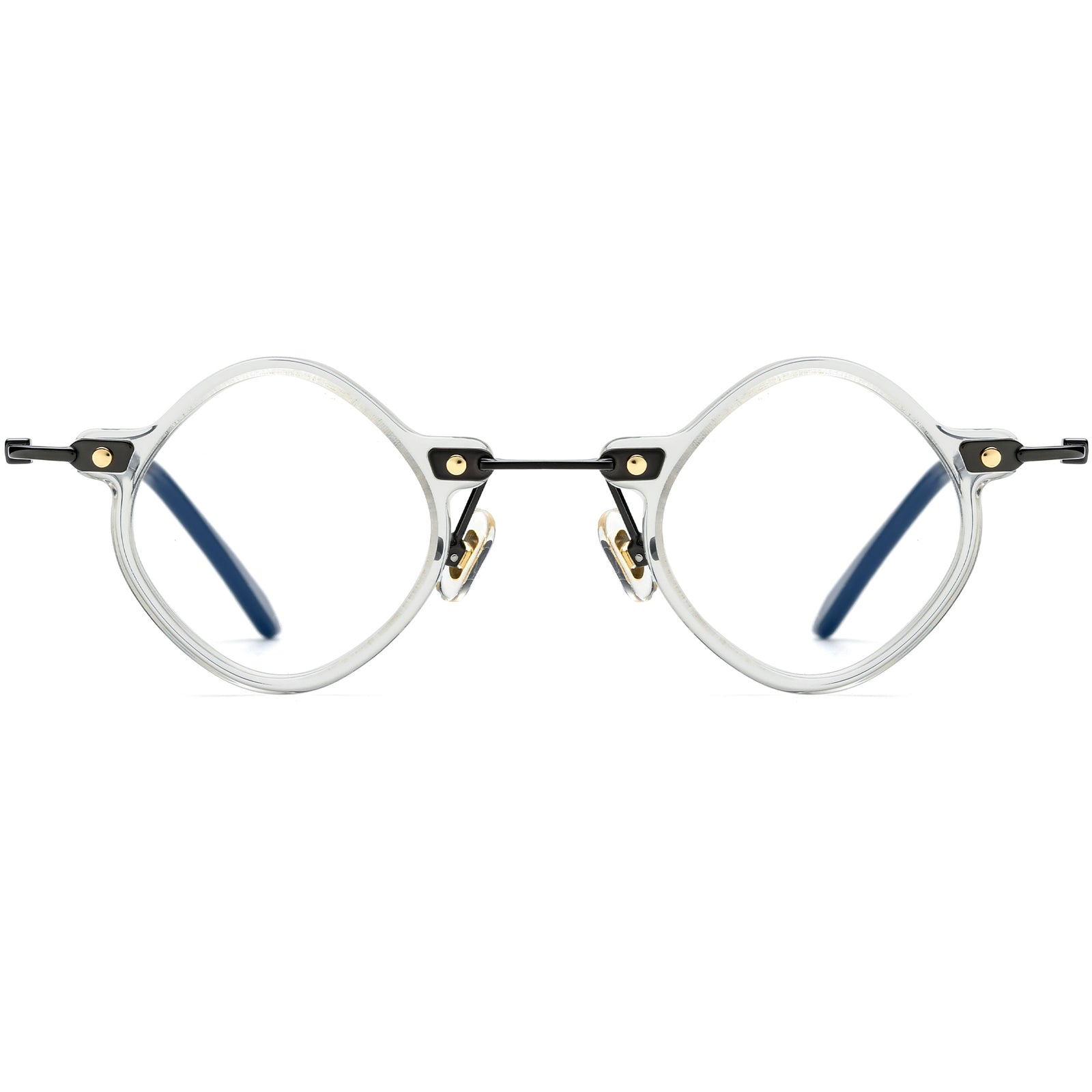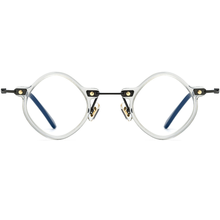These vintage-inspired geometric glasses combine elegance with a touch of modern design. Crafted from a mix of premium acetate and lightweight titanium, they feature a unique bridge and rivet details at the hinges for added charm. Adjustable silicone nose pads ensure a comfortable and secure fit, making them perfect for extended wear. Available in a variety of colors, including classic black, tortoiseshell, gray and transparent, these frames are ideal for adding a sophisticated touch to your everyday look.