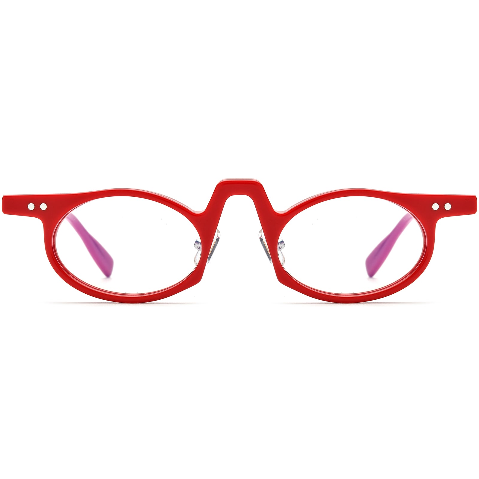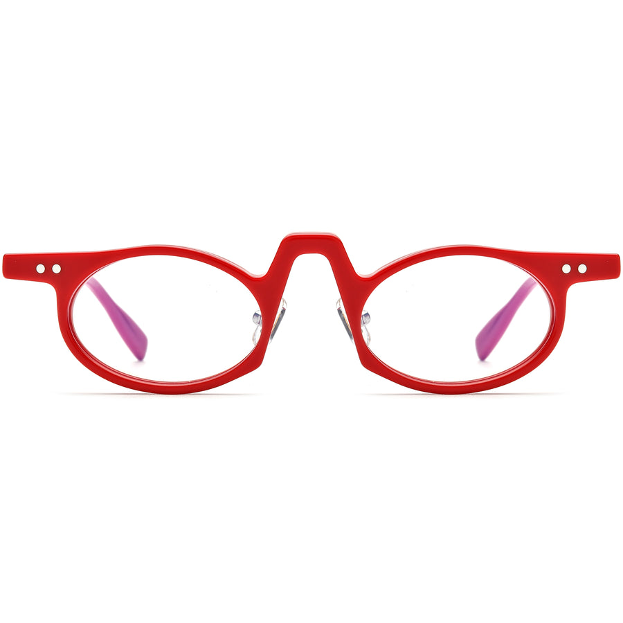 This bold oval-shaped eyewear features a statement-making full acetate frame with a unique sculpted nose bridge and distinct geometric design. Accented with two silver rivets on each corner and temple arm, the glasses bring a blend of retro inspiration and modern flair. Adjustable nose pads and sleek temple arms ensure a comfortable fit. Perfect for those seeking a striking, artistic style, this frame is suitable for both everyday wear and special occasions. Available in tortoiseshell, transparent, red, gray, blue, and black, they offer a stylish, artistic flair that suits different preferences and face shapes.