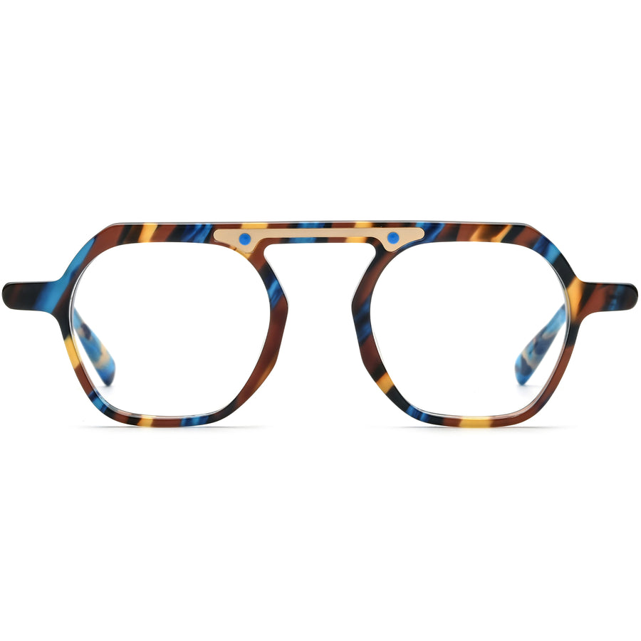 These geometric acetate glasses feature a full-frame design with striking hexagonal lenses and playful color options. The integrated nose pads are ergonomically designed for a comfortable, secure fit, while the embedded metal detail at the bridge adds a unique touch of elegance. Durable and sturdy, they are perfect for daily wear and offer long-lasting performance. Designed to complement round face shapes, these glasses combine style, comfort, and personality, making them a versatile choice for any occasion.