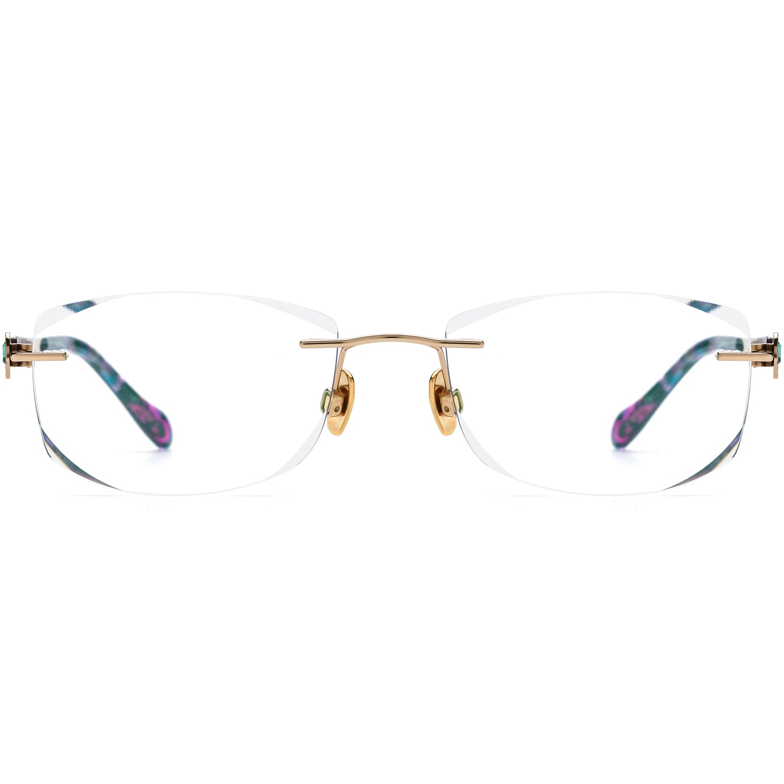 Elevate your everyday look with these elegant rimless women's rectangle glasses, crafted from ultra-lightweight titanium for durability and lasting comfort. The minimal frame design highlights a sleek gold/silver bridge paired with vibrant patterned temples for a touch of personality. Adjustable titanium nose pads ensure a secure, customized fit, while the refined silhouette flatters most face shapes. Perfect for work or casual wear, these stylish rectangle eyeglasses combine modern sophistication with all-day comfort, making them an ideal choice for fashion-forward women.