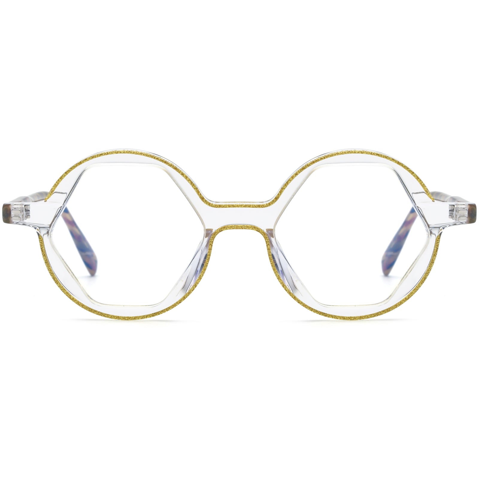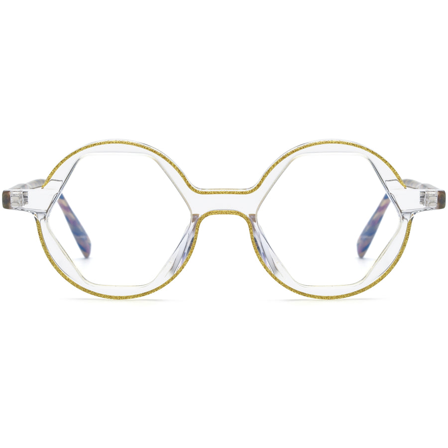 These high-quality geometric eyeglasses effortlessly blend retro style with a modern twist. Featuring unique glittery lines along the round outer rims and a hexagonal lens shape, they offer a distinct look. The double-dot details on the temples and matching temple arm colors make them both eye-catching and comfortable. Available in avant-garde green, gray and six other translucent color options, these glasses are perfect for those seeking a playful yet stylish design that provides a comfortable fit.