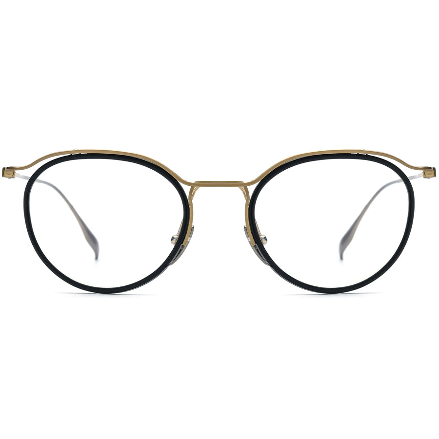 This captivating round frame seamlessly blends retro aesthetics with modern sophistication. Featuring a sleek metal frame with delicate acetate inlays, these glasses are a statement of elegance and durability. The adjustable titanium nose pads and lightweight design provide exceptional comfort for extended wear. Perfectly balanced between timeless charm and contemporary edge, this frame is an excellent choice for those with square or diamond face shapes who appreciate classic style with a touch of modern flair. Ideal for any occasion, offering both functionality and fashion-forward appeal.