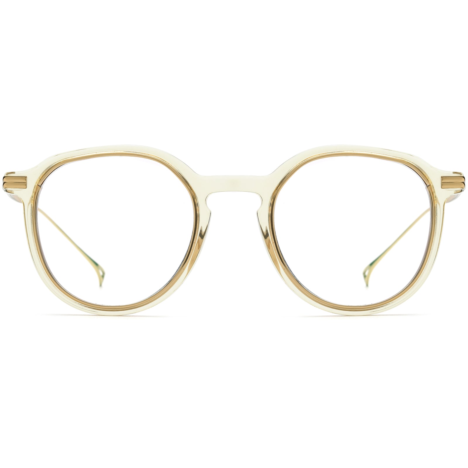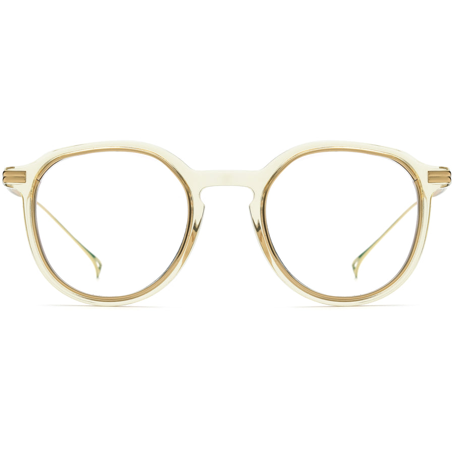 This full-rim round frame combines premium metal on the inside with refined acetate on the outside, creating a sophisticated and durable design. Uniquely positioned pure titanium nose pads sit lower on the frame for an upward fit, ensuring comfort and stability. A minimalist metal detail elegantly connects the slim temple arms to the frame, while cut-out temple tips add a modern touch. The keyhole bridge provides a secure and pressure-free fit, making these glasses a perfect blend of style, comfort, and functionality.