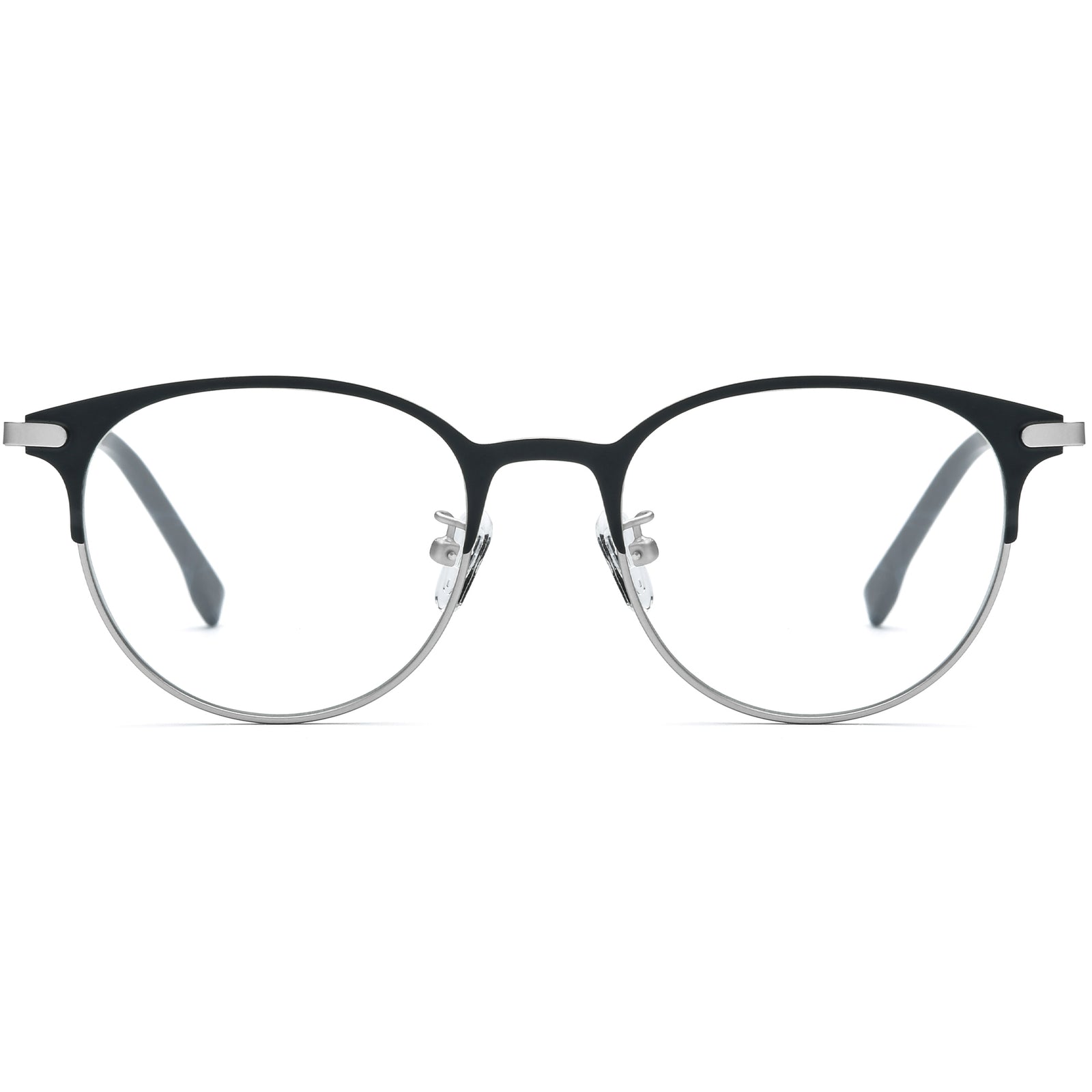 These medium-sized round glasses feature a full-rim design with a classic color browline for a sophisticated, balanced look. A minimalist metal detail elegantly connects the temple arms to the frame, adding a subtle modern touch. Adjustable nose pads ensure superior comfort and a perfect fit for all-day wear. Versatile enough for both professional and casual settings, these glasses are ideal for complementing square and diamond face shapes, offering a refined and stylish appeal.