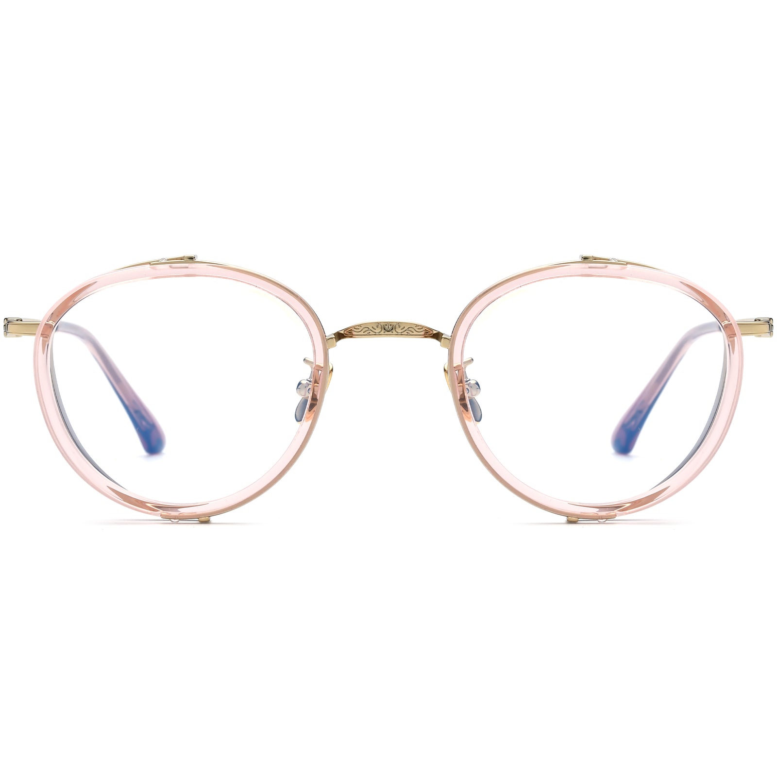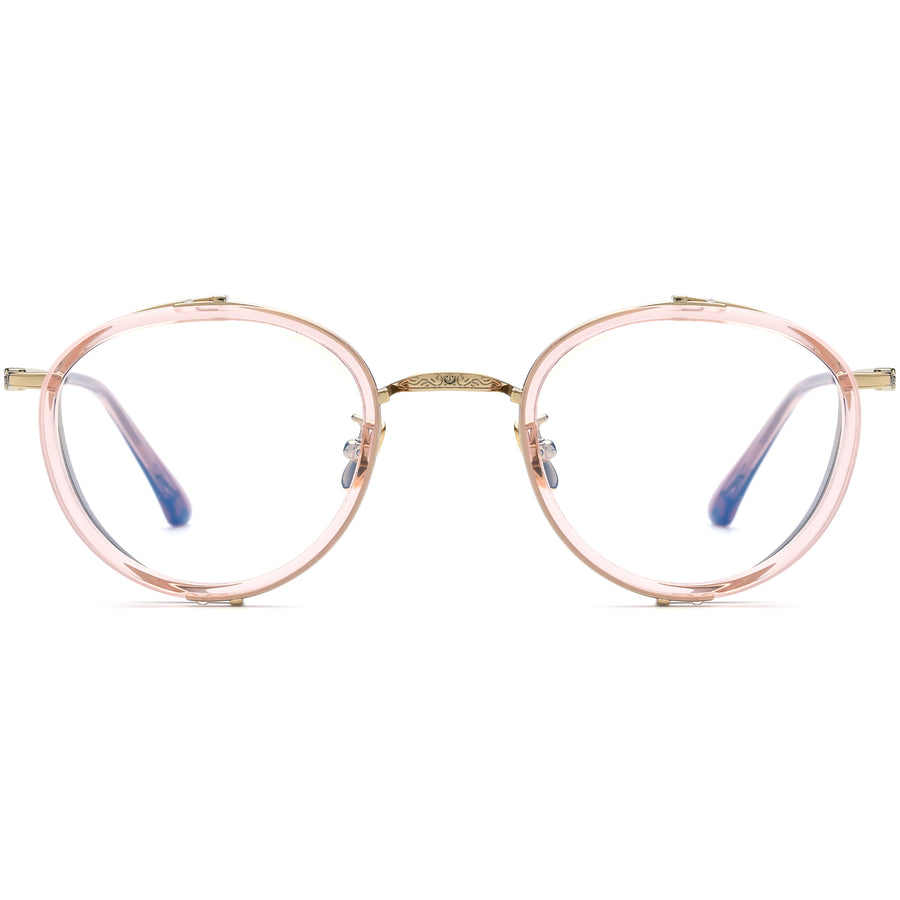 This frame presents a vintage-vibe design with premium materials and a sleek finish. The glossy acetate frame adds a touch of lightness, while the delicate details embedded in the titanium rims evoke a sense of celestial wonder. The cut-out design at the temple arms introduce a soft, dynamic texture, giving the frame a fluid, almost organic feel. The overall aesthetic is modern and stylish, with an artistic edge that combines both whimsical and refined elements. They ensure enhanced comfort and an exact fit with titanium and adjustable nose pads.