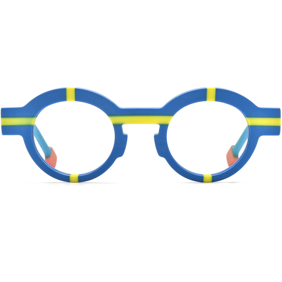 Experience boldness with these matte-finished round glasses, featuring a unique cross pattern on the front rim that adds an eye-catching detail. The thick temple arms and colorful, square temple tips blend modern design with retro flair, making a distinctive statement. Comfortable and durable, these glasses are perfect for square or diamond face shapes, offering both style and functionality. A standout accessory for those looking to combine contemporary trends with timeless appeal.