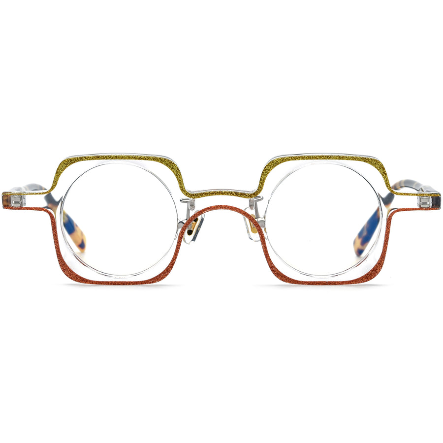 These acetate frames feature a bold geometric design, uniquely blending square exteriors with round inner lenses for a striking visual statement. Accentuated with dazzling glitter details along the edges, these glasses bring a touch of sparkle to your look. Two silver dot accents at the temples complete the sophisticated aesthetic. Perfect for those seeking a combination of style and individuality, these frames stand out as a fashionable and modern accessory.