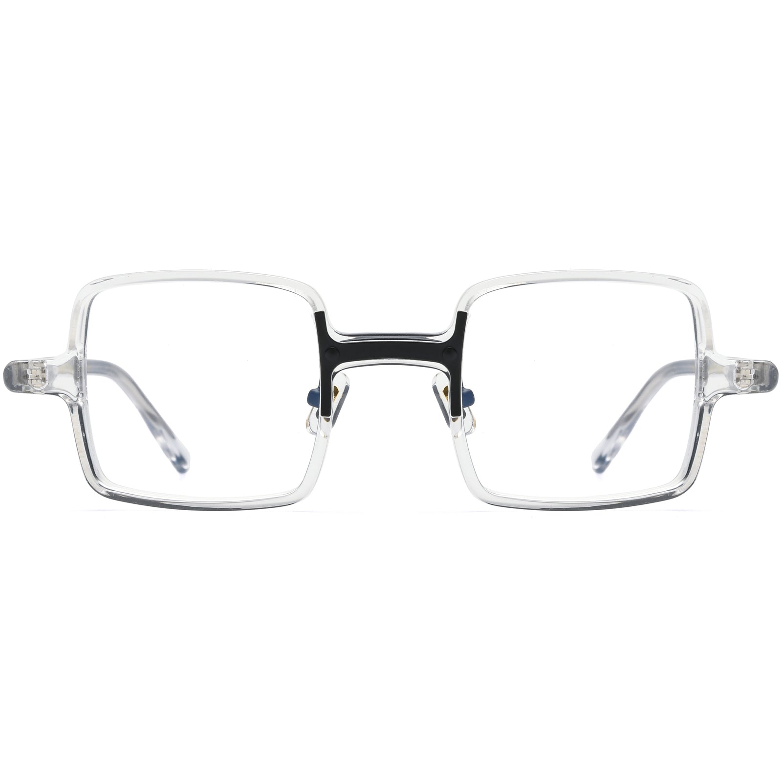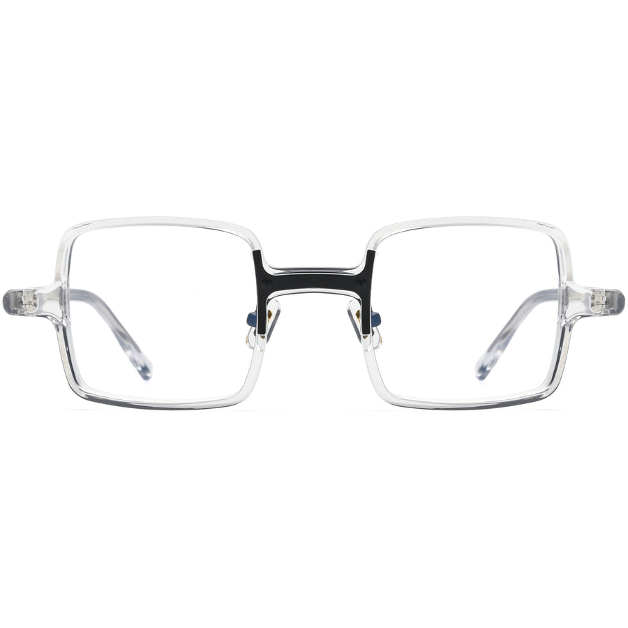 These square acetate glasses feature a full-frame design that is lightweight and comfortable, perfect for daily wear. A contrasting H-shaped metal accent on the nose bridge adds a unique and stylish touch. The adjustable, soft nose pads ensure a snug, pressure-free fit for all-day comfort. Available in black, orange, green, and transparent options, these glasses are ideal for oval and heart-shaped faces, combining functionality with a bold sense of style.