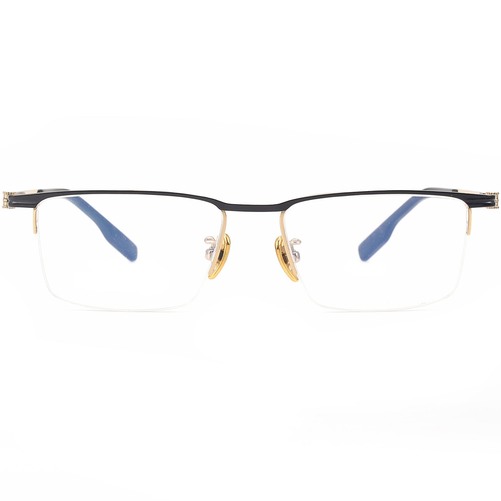 Men’s half-rim titanium eyeglasses—ultra-light, strong, and corrosion-resistant. Modern rectangular browline with brushed finish, flexible hinges, adjustable titanium nose pads, and comfy acetate tips. Available in black-gold, gunmetal, silver, and coffee. Ready for prescription or blue-light lenses, these minimalist frames deliver a sharp professional look with all-day comfort. Size 55-17-141. Ideal everyday eyewear for office, driving, and study. Shop premium titanium glasses for men: featherweight durability, clean style, precision fit.