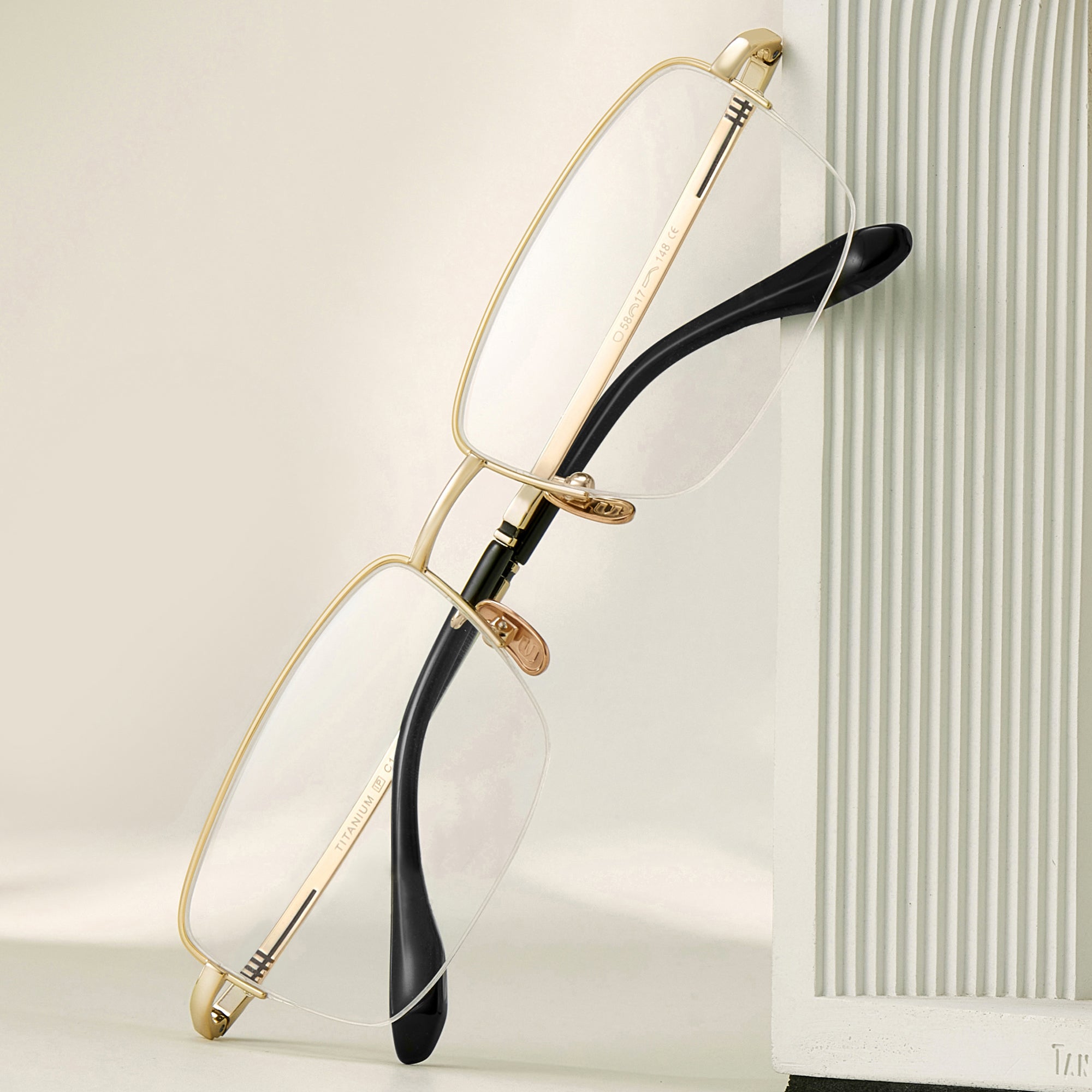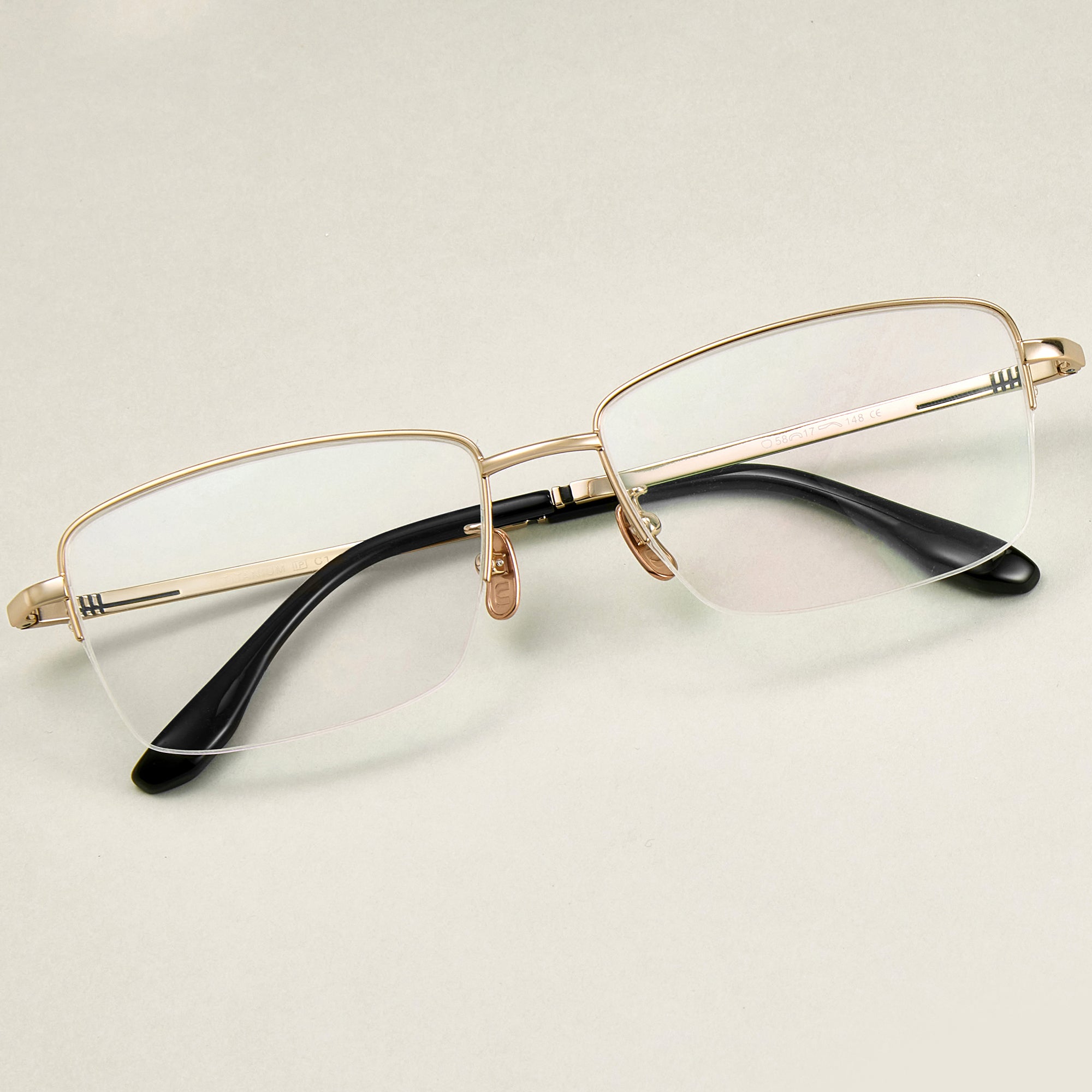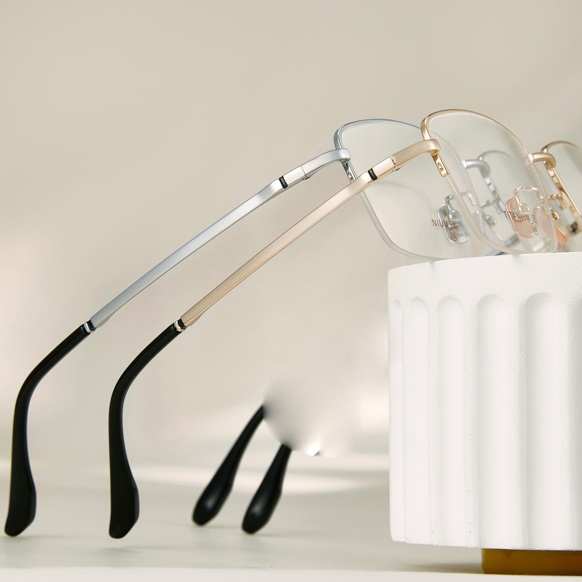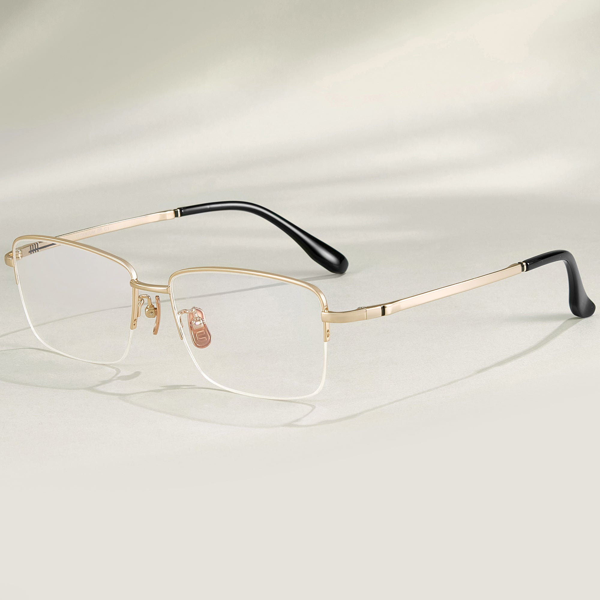 These rectangle glasses feature a half-rim design with wide frames tailored for men with larger heads. Crafted from lightweight and durable titanium, these frames offer all-day comfort while maintaining a sleek profile. The adjustable nose pads provide a customized fit for optimal wearability. Available in timeless colors like black, silver, gold, and gray, these glasses combine classic style with modern materials, making them a versatile and sophisticated addition to any wardrobe.
