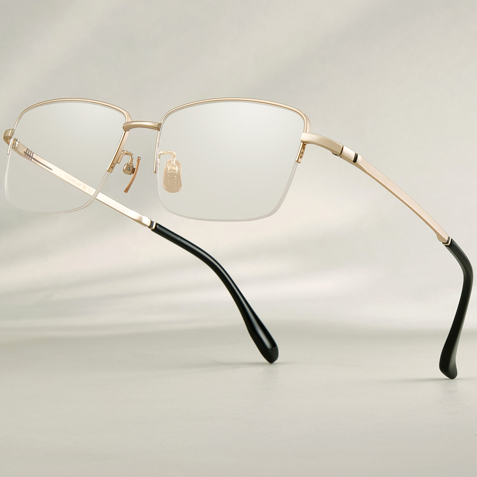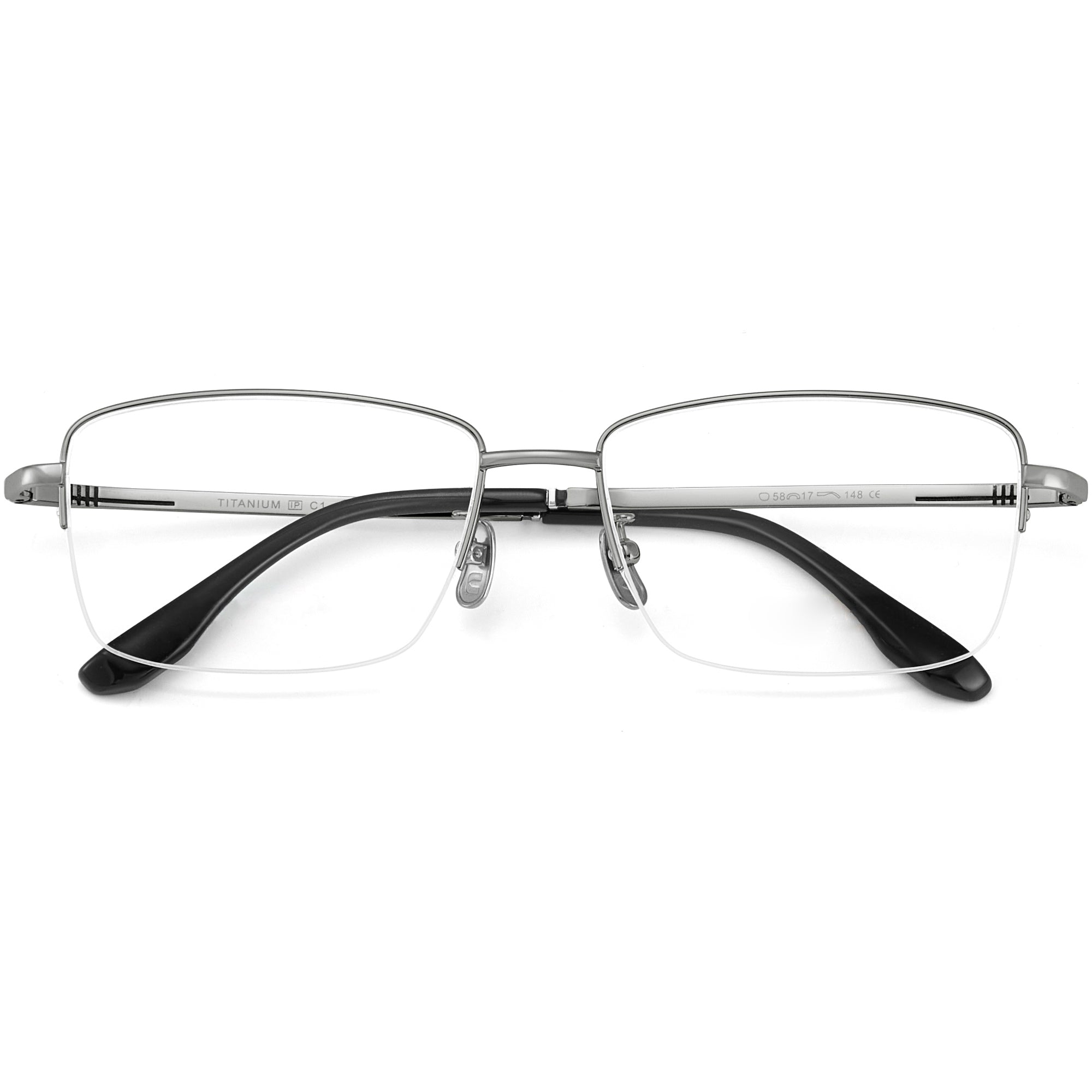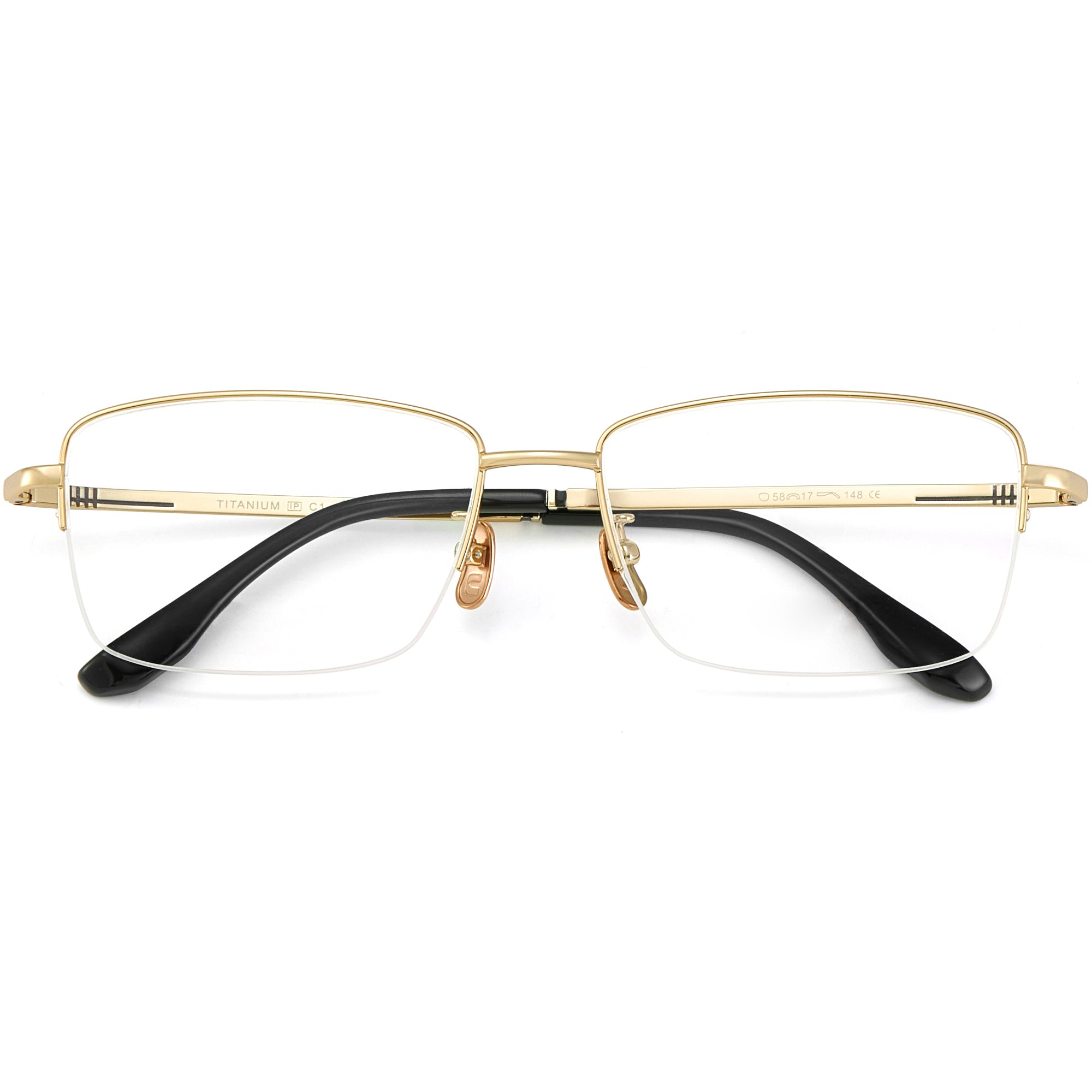 These rectangle glasses feature a half-rim design with wide frames tailored for men with larger heads. Crafted from lightweight and durable titanium, these frames offer all-day comfort while maintaining a sleek profile. The adjustable nose pads provide a customized fit for optimal wearability. Available in timeless colors like black, silver, gold, and gray, these glasses combine classic style with modern materials, making them a versatile and sophisticated addition to any wardrobe.