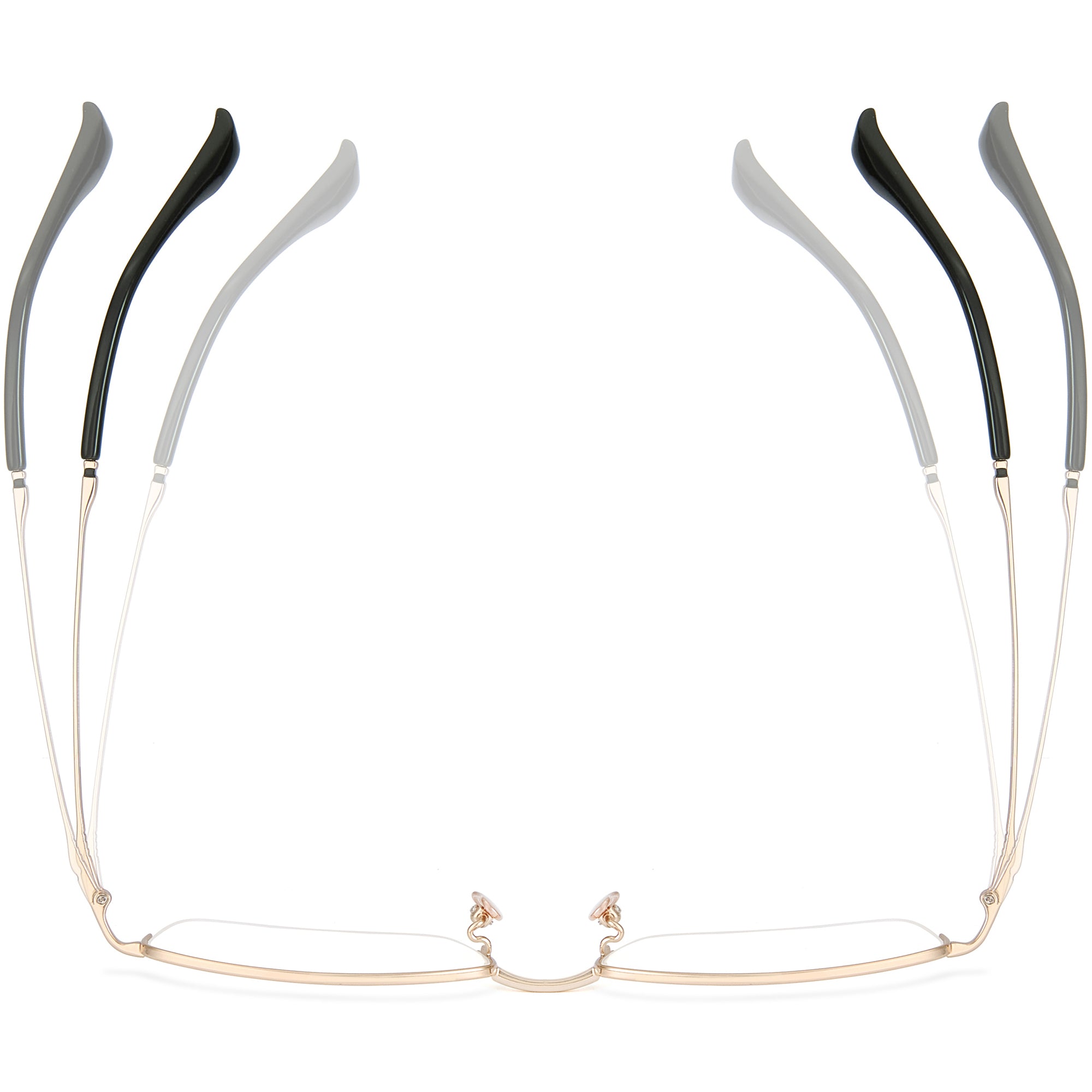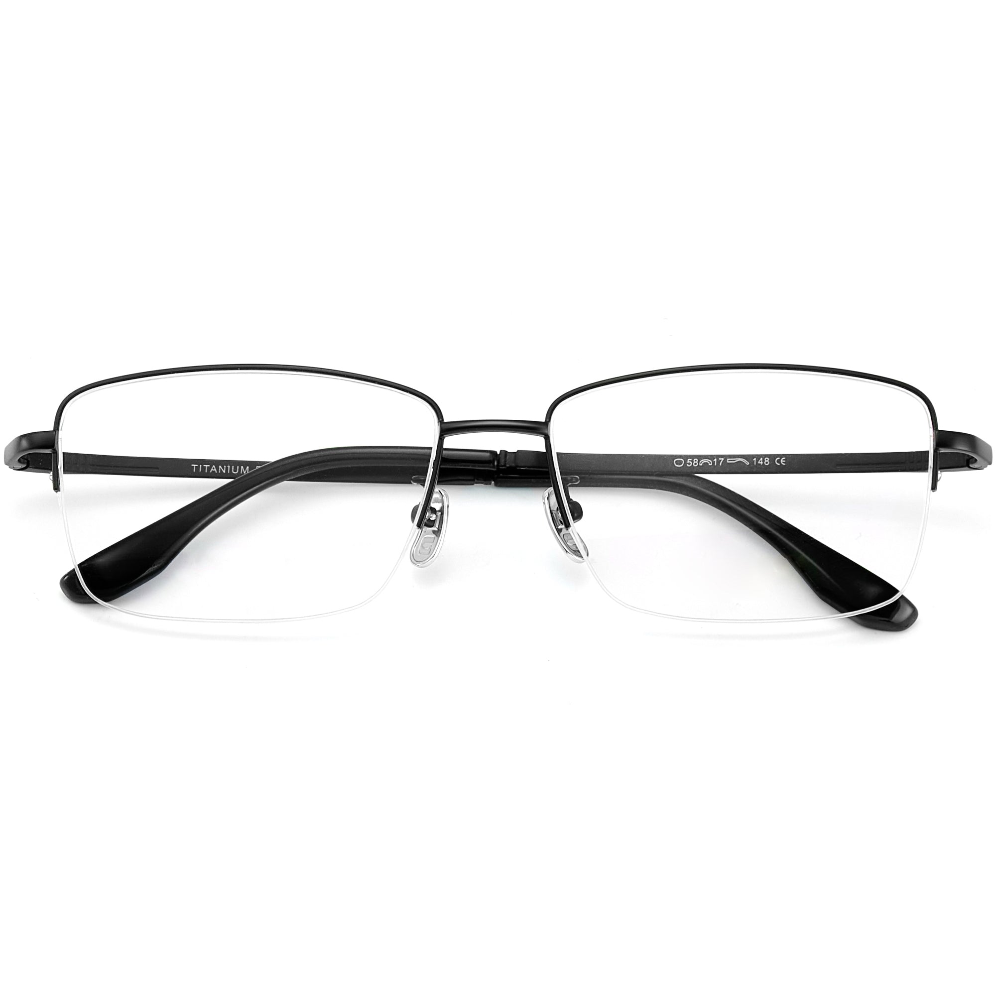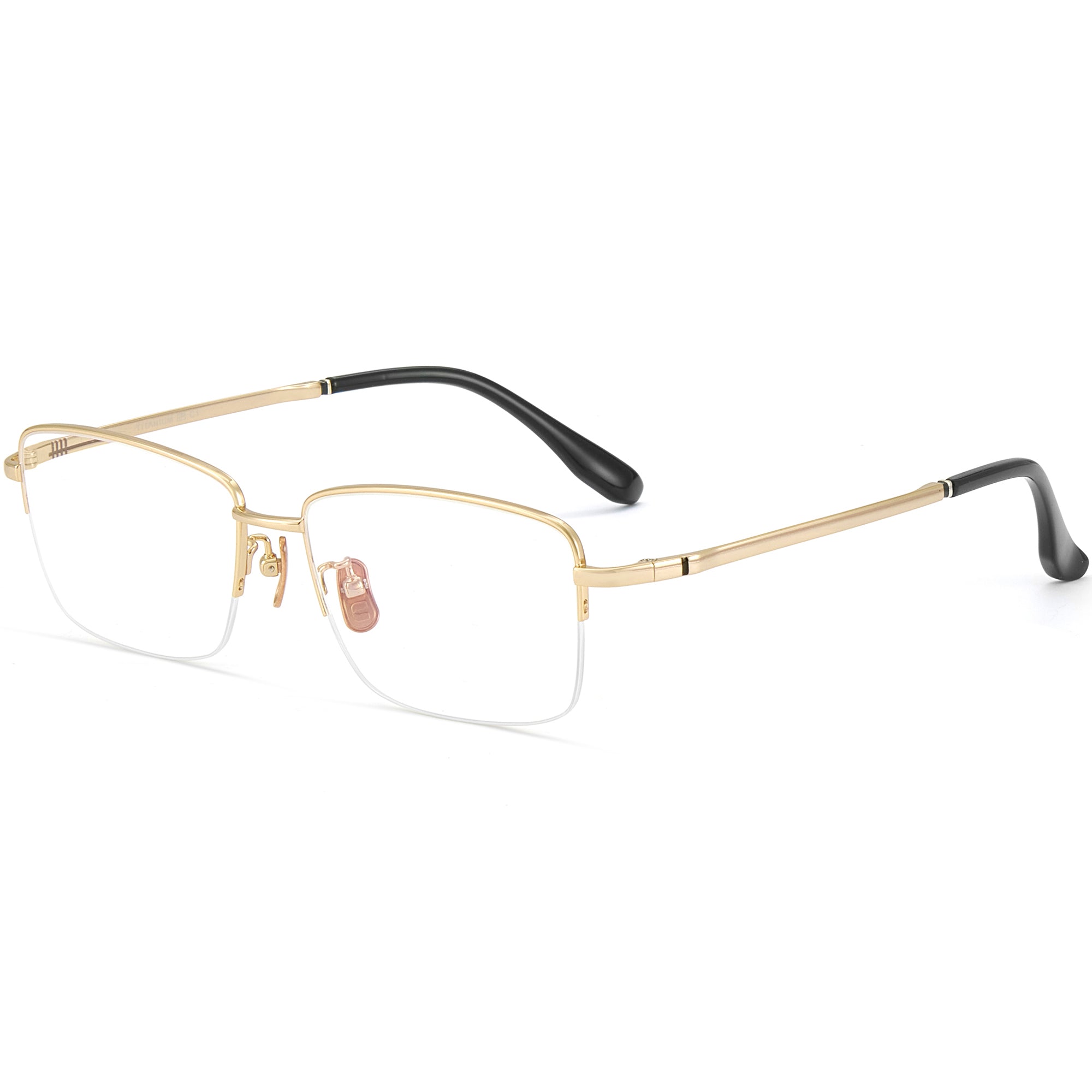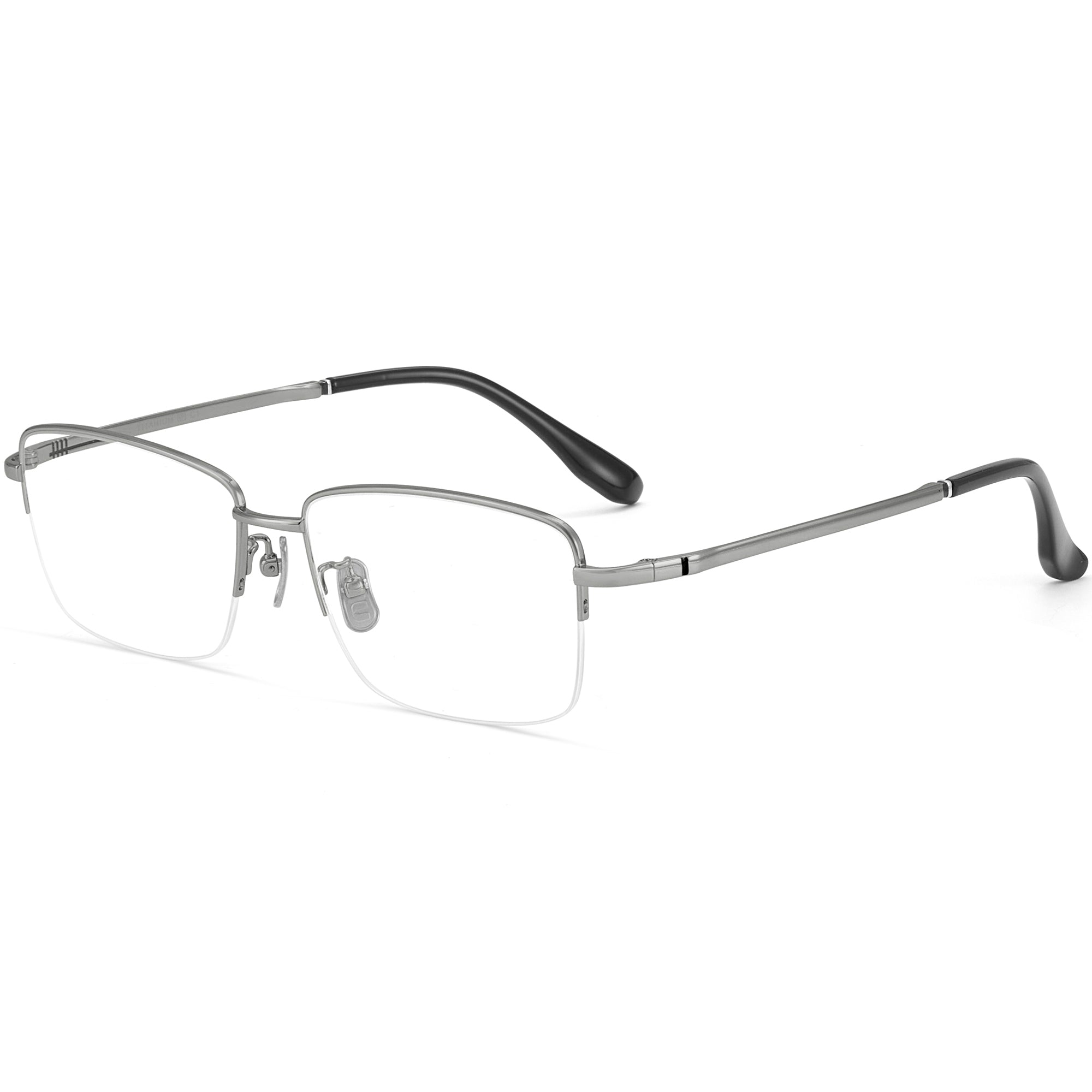 These rectangle glasses feature a half-rim design with wide frames tailored for men with larger heads. Crafted from lightweight and durable titanium, these frames offer all-day comfort while maintaining a sleek profile. The adjustable nose pads provide a customized fit for optimal wearability. Available in timeless colors like black, silver, gold, and gray, these glasses combine classic style with modern materials, making them a versatile and sophisticated addition to any wardrobe.