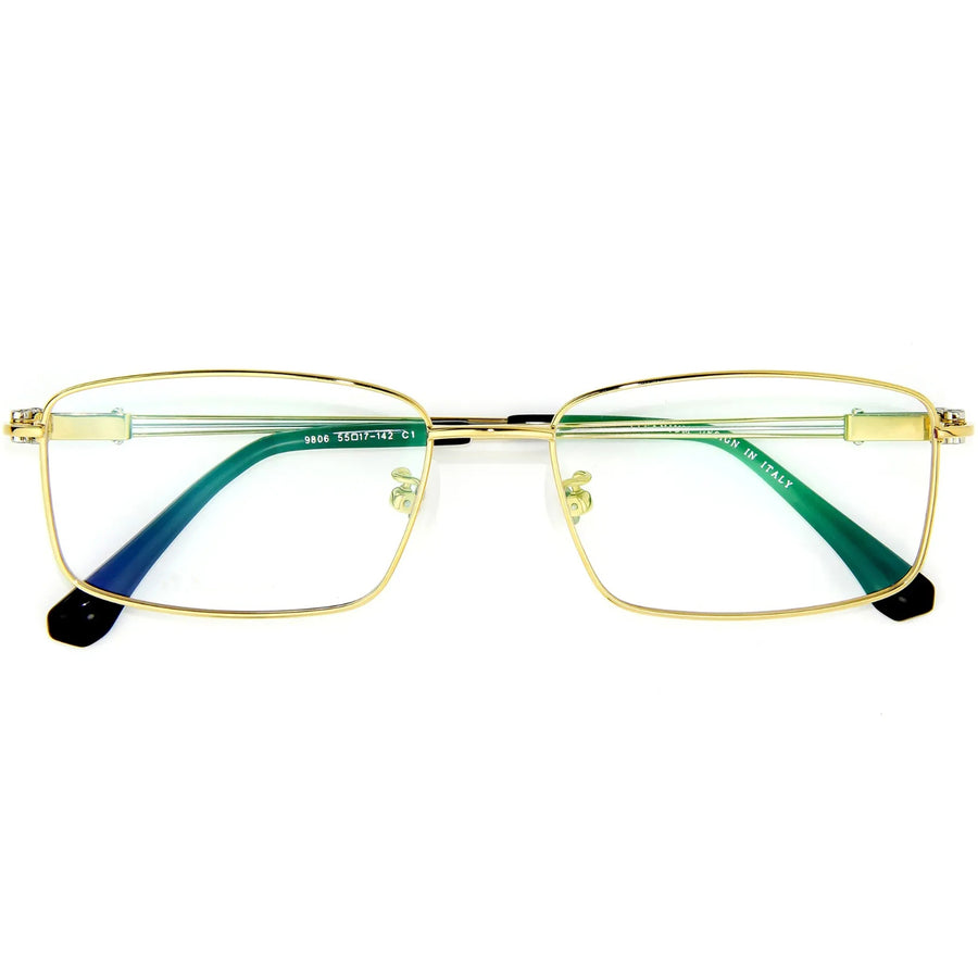 Discover the pinnacle of elegance with these full-rim rectangular eyeglasses. Crafted from durable titanium, their metallic frame is complemented by adjustable nose pads. A jade accent graces the temple, set within a unique three-line design, with the central line showcasing a contrasting hue. Long, smooth acetate tips enhance comfort. Available in luxurious gold, sleek silver, and sophisticated gray, these glasses radiate quality and style.