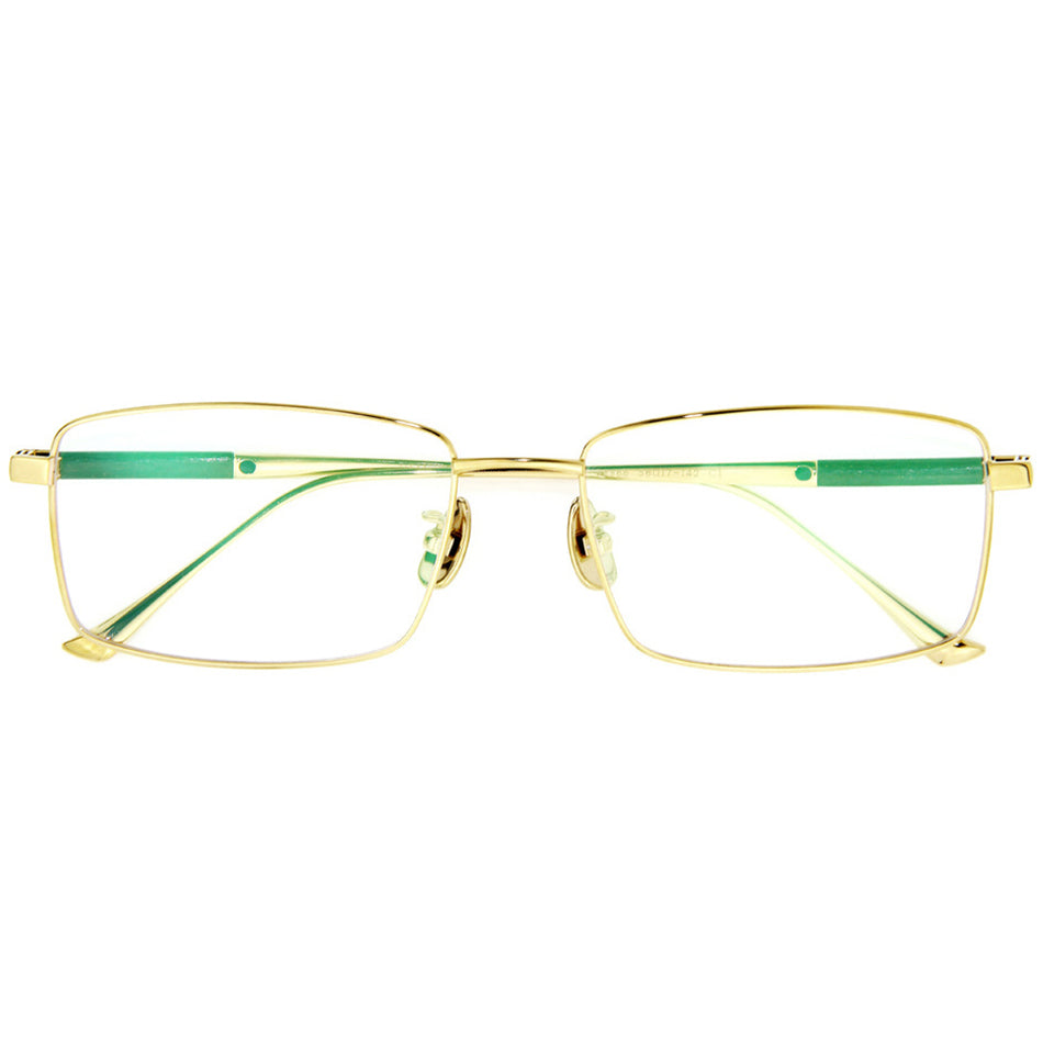 Introducing our exquisite titanium eyeglasses - a perfect blend of durability and style. Designed with a full rim rectangle frame, these glasses offer a sleek metallic finish in gray, silver, and gold. The adjustable nose pads ensure a comfortable fit for all-day wear. Elevating the elegance, the temples feature a refined wood ornament. Experience unparalleled quality and sophistication in one pair of glasses.