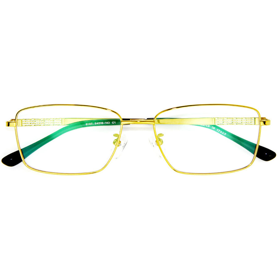 Elevate your vision with these metallic, full-rim rectangular eyeglasses crafted from durable titanium. A unique design emerges with the temple featuring four wavy lines, the central duo standing out in contrasting colors. Acetate temple tips and adjustable nose pads combine comfort with style, creating a harmonious blend of contemporary aesthetics and everyday functionality.