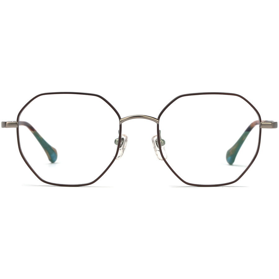 Introducing our chic and contemporary eyeglasses, featuring a unique octagon shape that sets you apart from the crowd. The full-rim design crafted from flexible β titanium ensures durability and a comfortable fit for everyday wear. The acetate temple tip adds a touch of sophistication to the frames. With adjustable nose pieces, you can customize the fit to your liking. Choose from a stunning array of colors, including black gold, black silver, brown, rose gold, black, and silver, to complement your style and make a bold fashion statement wherever you go.