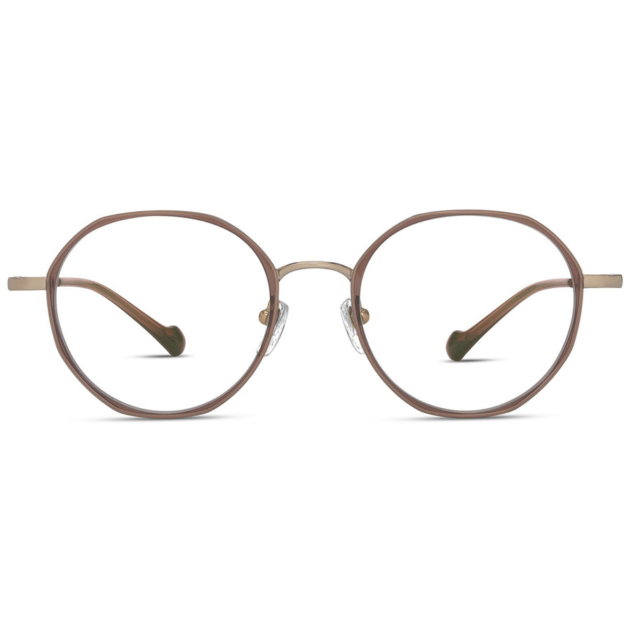 Elevate your style with our unique eyeglasses frame, where the inner round rim is gracefully contrasted by an outer geometric contour. Crafted with flexible β titanium, it promises durability without compromising on weight. The delicate acetate lining the inner rim enhances its elegance, and the acetate temple tips ensure extended comfort. Small lenses are perfectly suited for those who prioritize both fashion and functionality. With adjustable nose pads for a tailored fit and a color palette spanning from brown to rose gold, your perfect pair awaits.