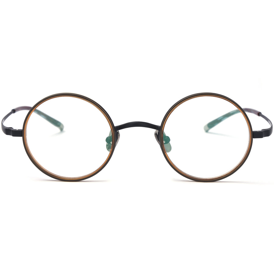 Introducing our trendy and lightweight round eyeglasses that blend style and comfort effortlessly. Crafted with flexible β titanium, these full-rim glasses promise durability for everyday use. The unique design showcases a different color acetate rim inside the outside titanium rim, adding a touch of chic contrast. The small narrow lenses exude a modern and sophisticated look. With adjustable nose pads, these glasses offer a customized fit for enhanced wearability. The acetate temple tip adorned with silver accents completes the design with elegance. Embrace the perfect accessory to make a bold fashion statement in any setting.