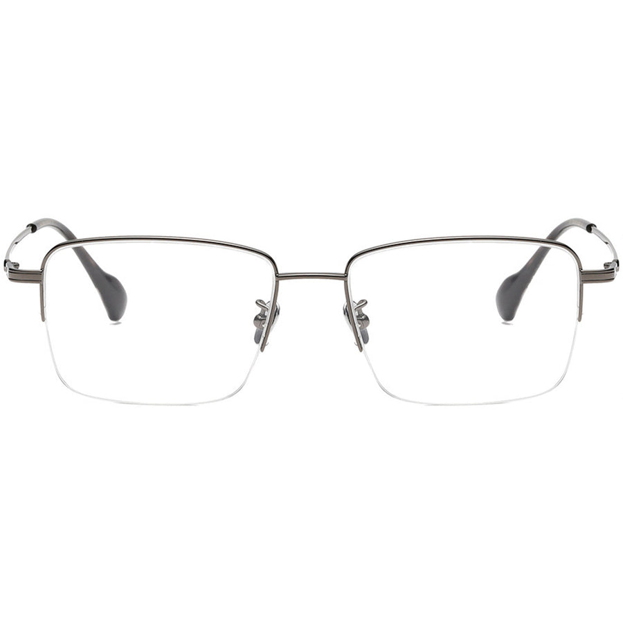 Sleek half-rim square eyeglasses with a lightweight titanium frame and clean, modern lines. The minimalist brow bar and rimless lower lenses create an open, professional look, while adjustable nose pads and slim patterned temples keep the fit comfortable all day. Finished in matte black/graphite for easy pairing with any outfit. Ideal as prescription glasses or computer blue-light frames for work, meetings, and daily wear—smart style for men and women.